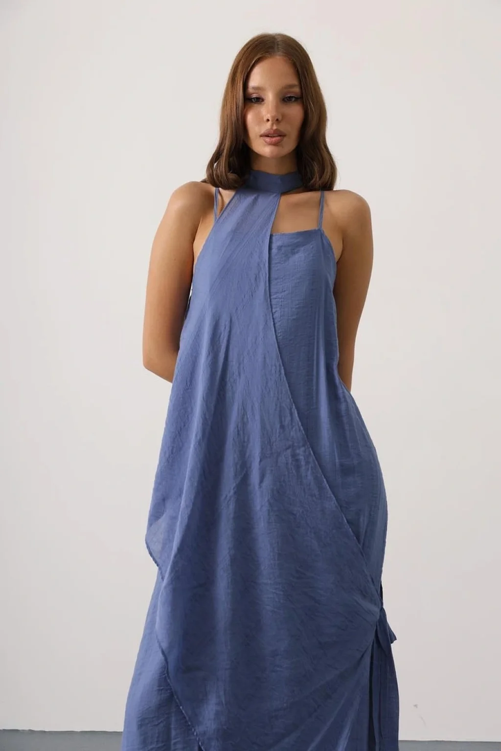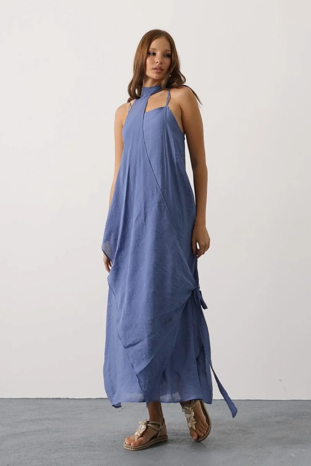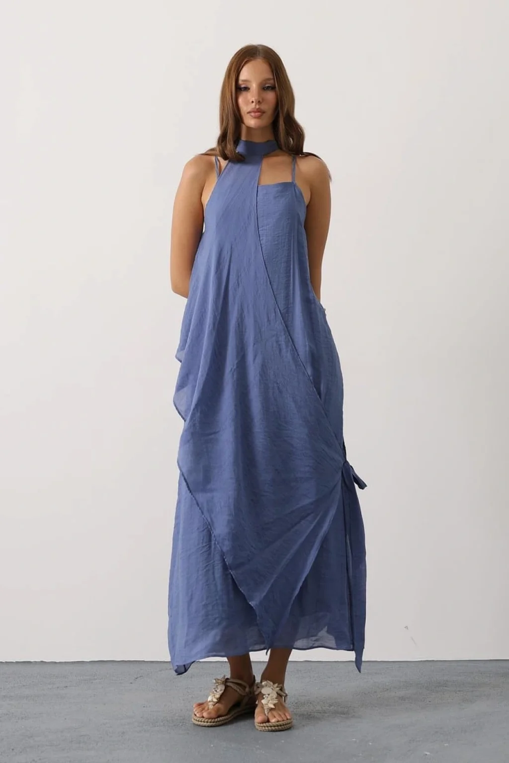 Aveline Bohem Elbise - İndigo, asimetrik kesimi ve bağlama detayıyla bohem şıklığı modern bir çizgide yeniden yorumluyor. %85 viskon ve %15 naylon karışımı kumaşıyla hafif, nefes alan ve dökümlü bir yapı sunar.