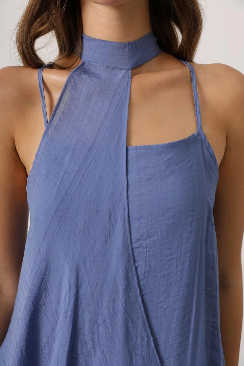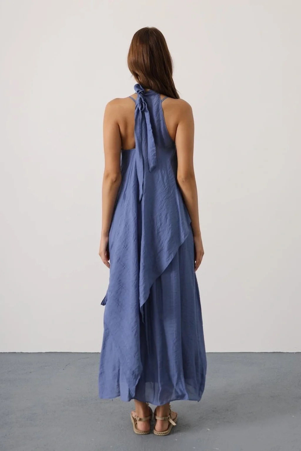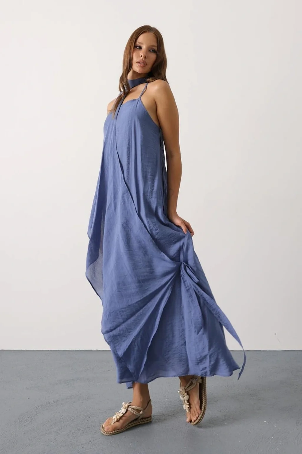 Aveline Bohem Elbise - İndigo, asimetrik kesimi ve bağlama detayıyla bohem şıklığı modern bir çizgide yeniden yorumluyor. %85 viskon ve %15 naylon karışımı kumaşıyla hafif, nefes alan ve dökümlü bir yapı sunar.