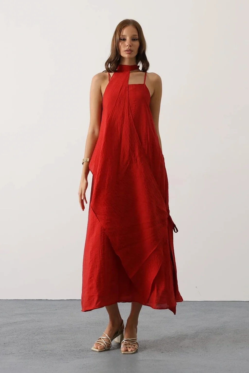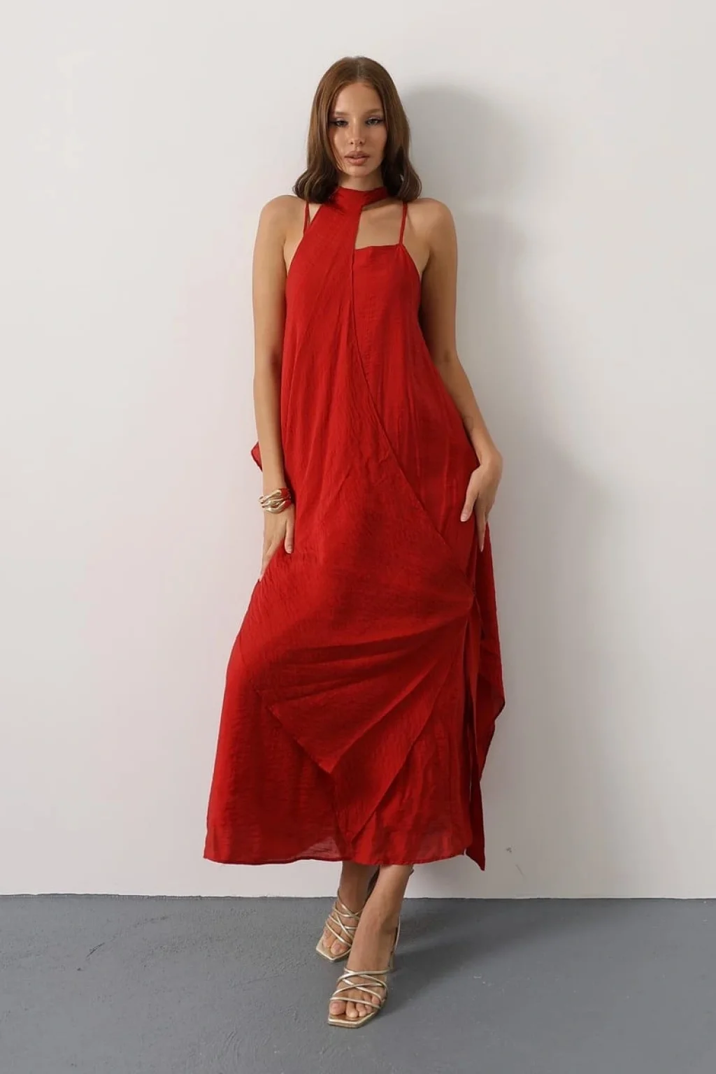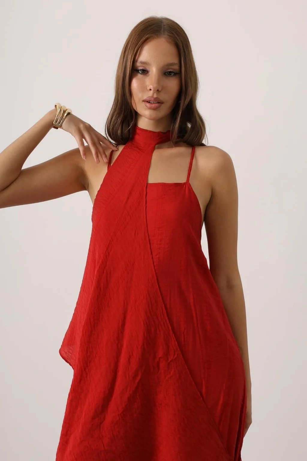 Aveline Bohem Elbise - Kırmızı, asimetrik kesimi ve bağlama detayıyla bohem şıklığı modern bir çizgide yeniden yorumluyor. %85 viskon ve %15 naylon karışımı kumaşıyla hafif, nefes alan ve dökümlü bir yapı sunar.
