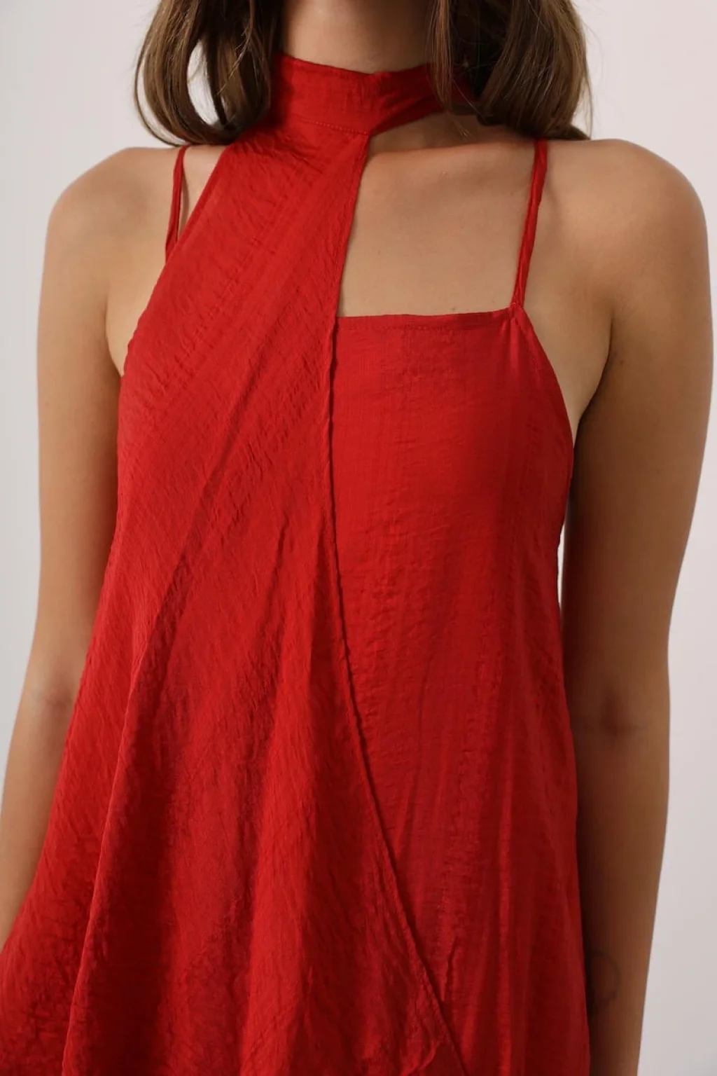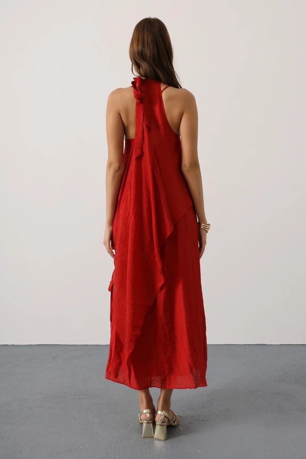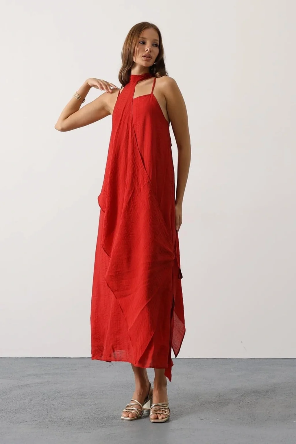 Aveline Bohem Elbise - Kırmızı, asimetrik kesimi ve bağlama detayıyla bohem şıklığı modern bir çizgide yeniden yorumluyor. %85 viskon ve %15 naylon karışımı kumaşıyla hafif, nefes alan ve dökümlü bir yapı sunar.