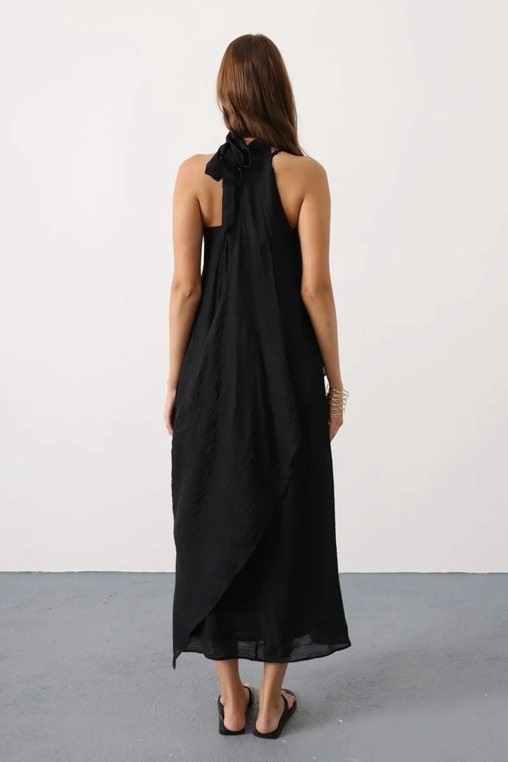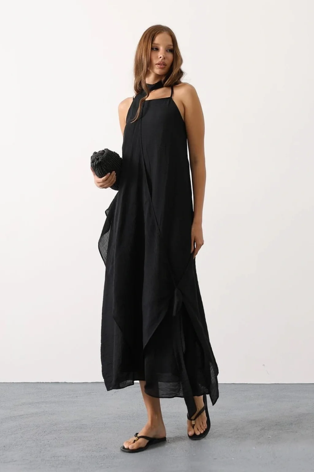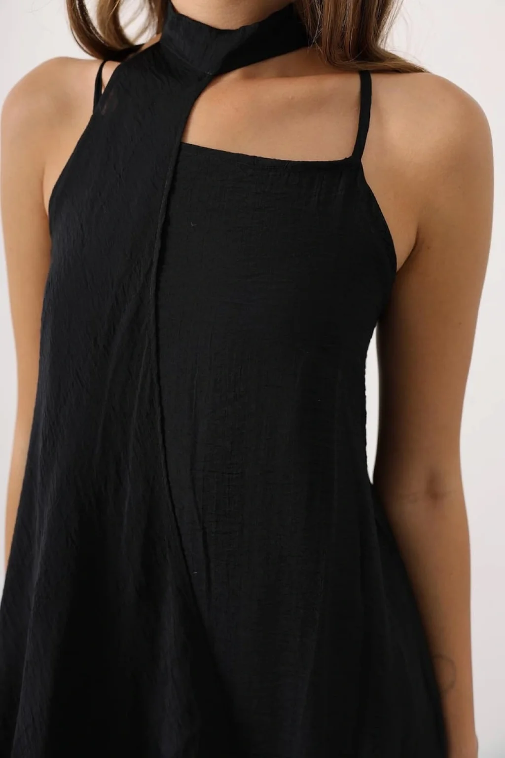 Aveline Bohem Elbise - Siyah, asimetrik kesimi ve bağlama detayıyla bohem şıklığı modern bir çizgide yeniden yorumluyor. %85 viskon ve %15 naylon karışımı kumaşıyla hafif, nefes alan ve dökümlü bir yapı sunar.