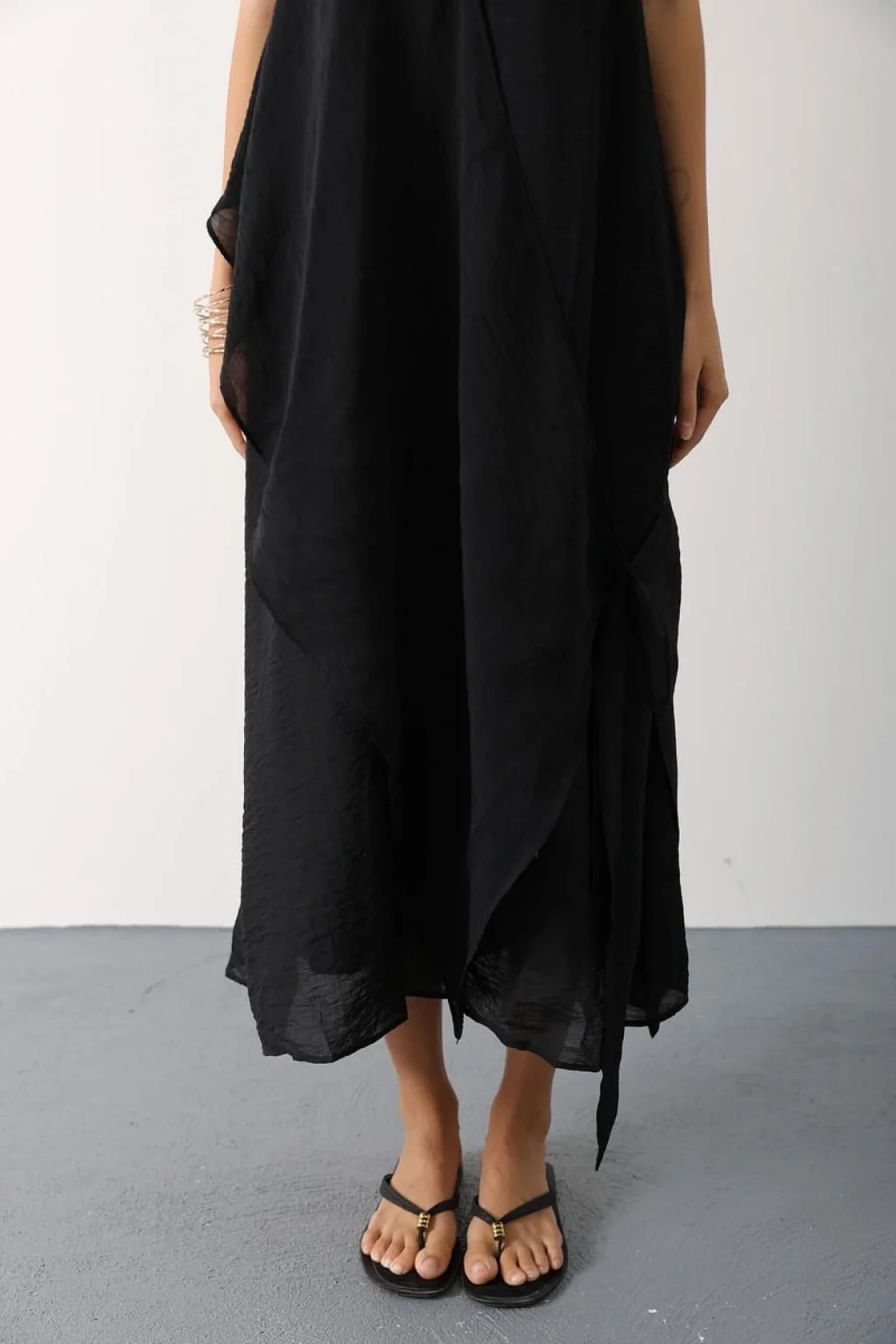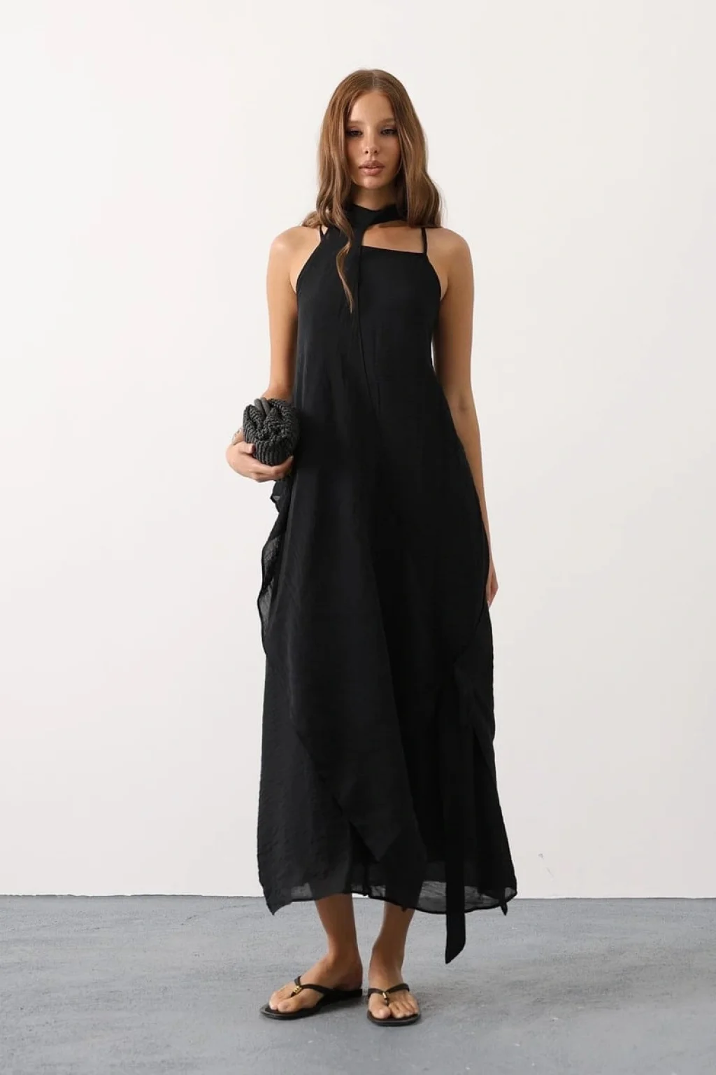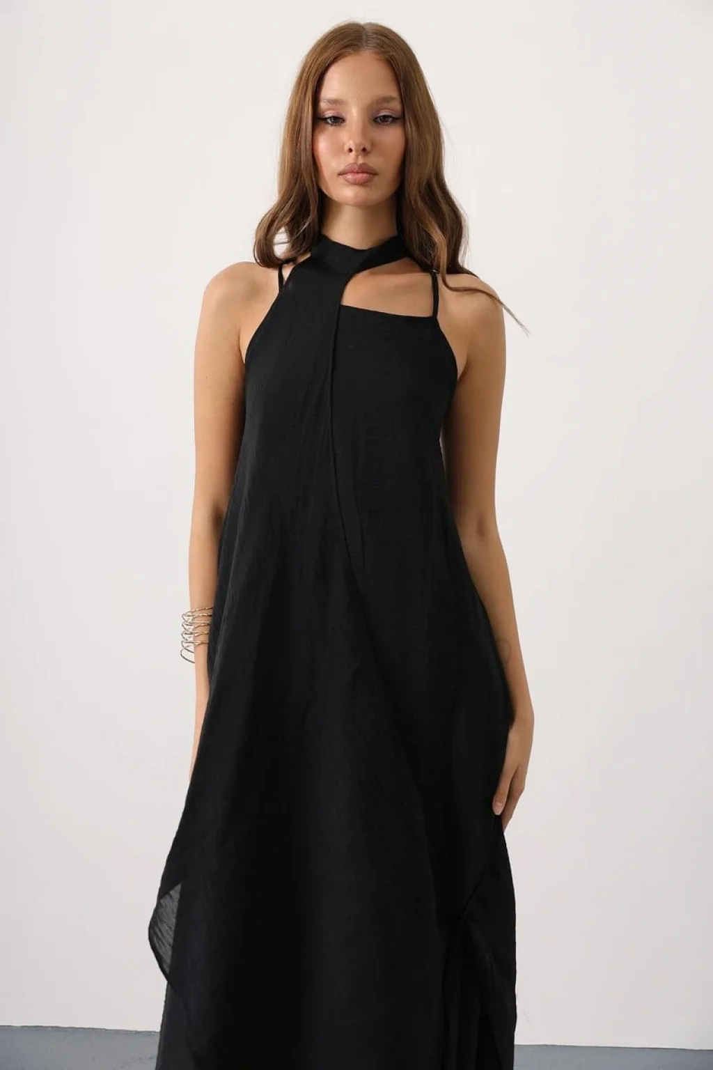Aveline Bohem Elbise - Siyah, asimetrik kesimi ve bağlama detayıyla bohem şıklığı modern bir çizgide yeniden yorumluyor. %85 viskon ve %15 naylon karışımı kumaşıyla hafif, nefes alan ve dökümlü bir yapı sunar.
