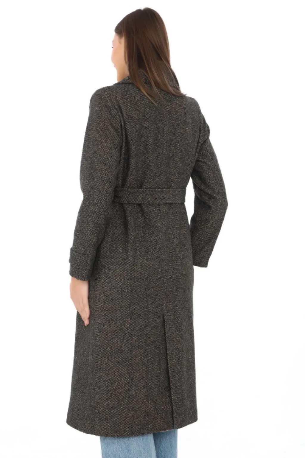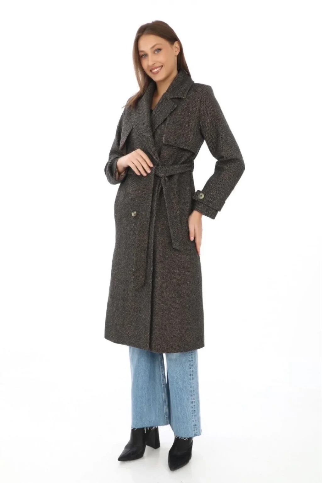 Balık Sırtı Yünlü Dokuma Kaşe Kaban – Kruvaze Yaka, Kuşaklı, Cepli, Astarlı Uzun Boy Tesettür Şık Kışlık Kaşe Kaban Modeli - Kahverengi