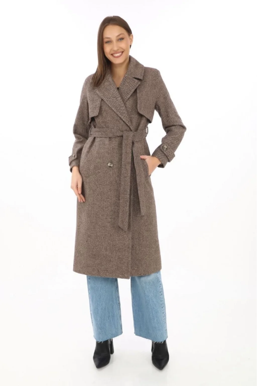 Balık Sırtı Yünlü Dokuma Kaşe Kaban – Kruvaze Yaka, Kuşaklı, Cepli, Astarlı Uzun Boy Tesettür Şık Kışlık Kaşe Kaban Modeli - Vizon