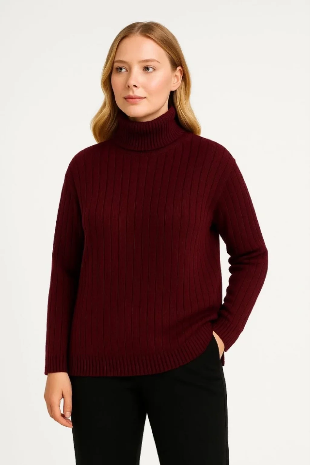 Balıkcı Yaka Bağazlı Triko Kazak Pamuklu Kalın Fitilli Dokuma - Bordo