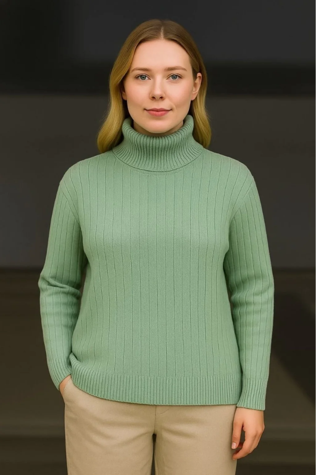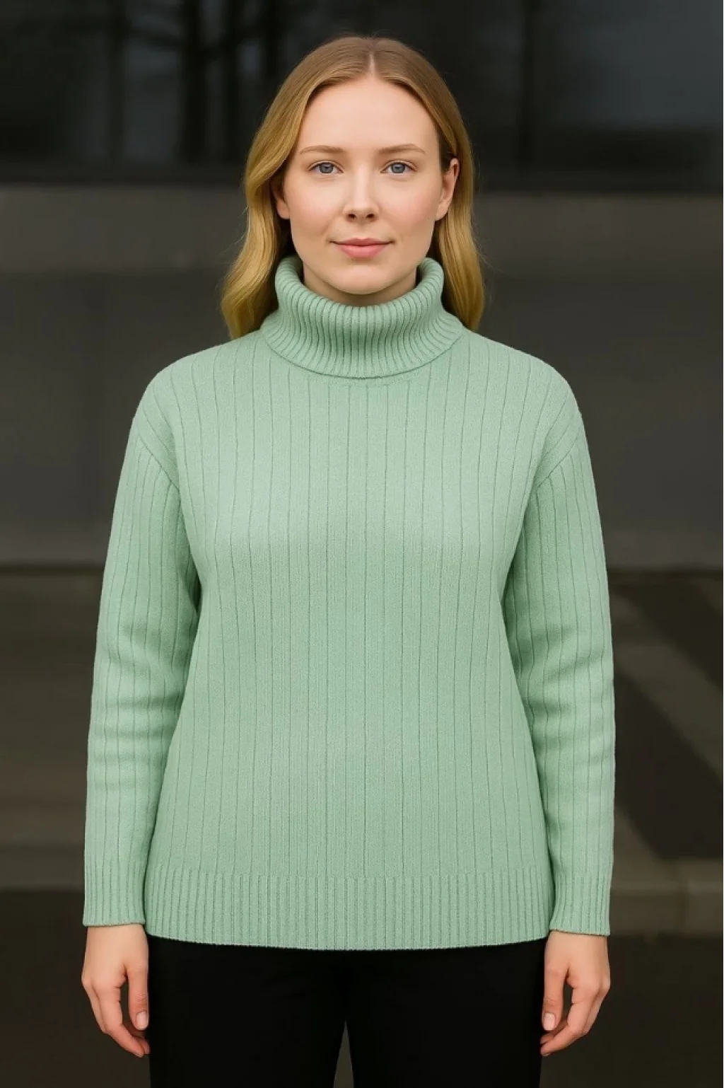 Balıkcı Yaka Bağazlı Triko Kazak Pamuklu Kalın Fitilli Dokuma - Mint Yeşili