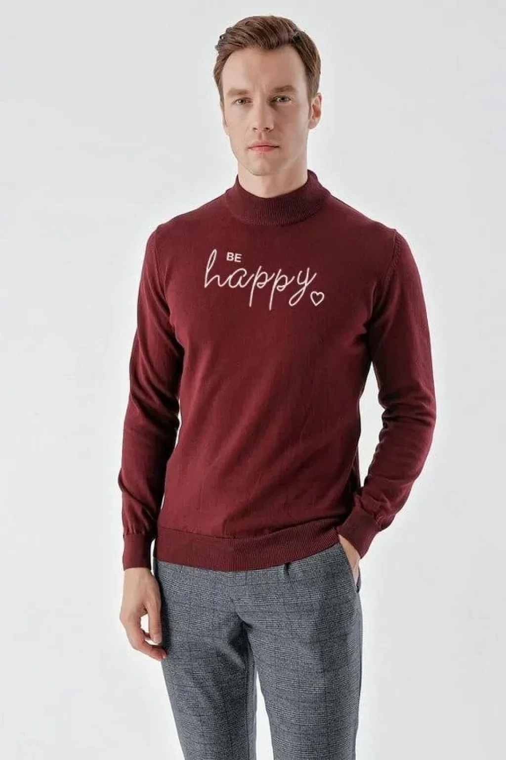 Baskılı Uzun Kol Yarım Boğazlı Dokuma Triko - Bordo