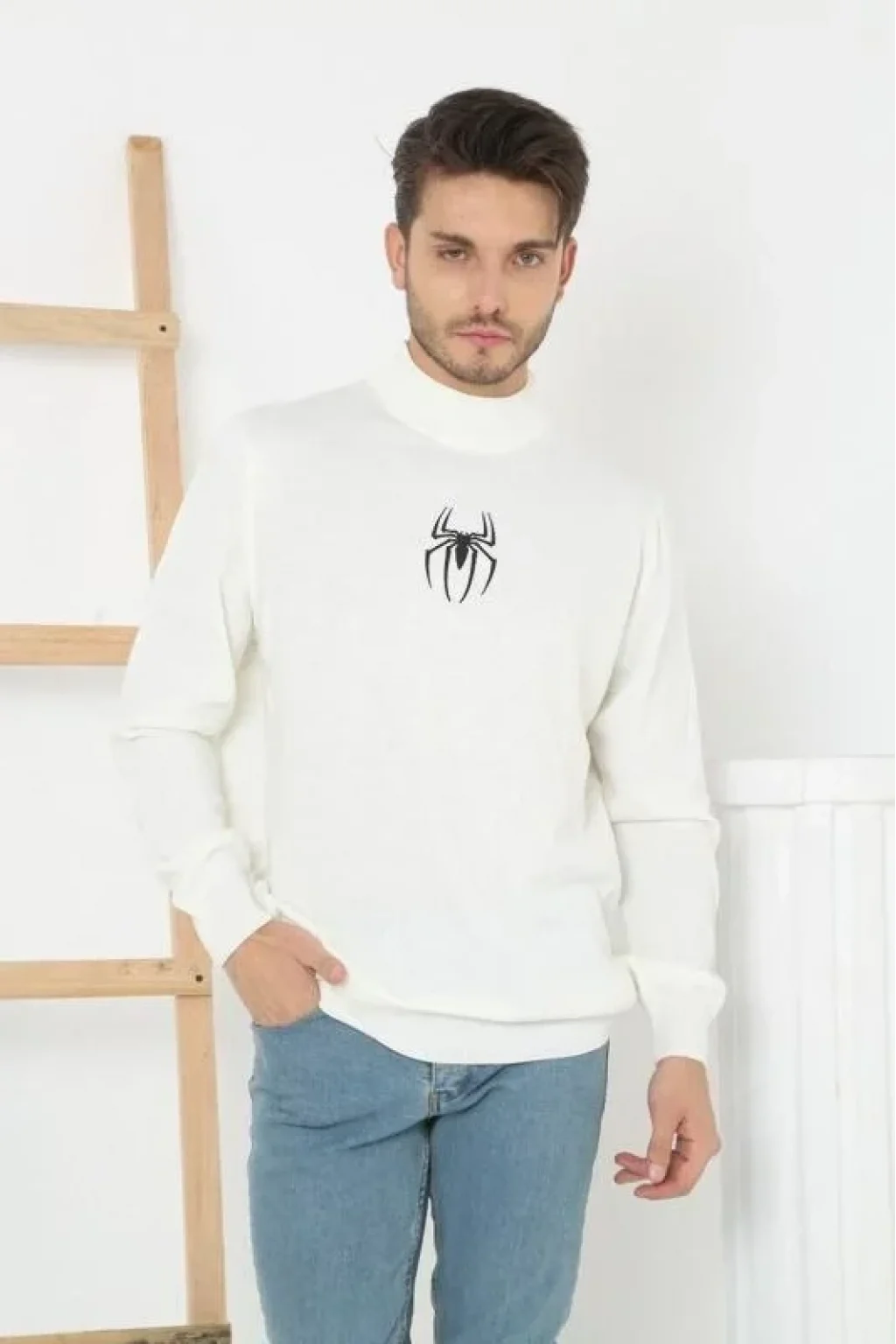 Baskılı Yarım Boğazlı Uzun Kol Dokuma Triko - Beyaz