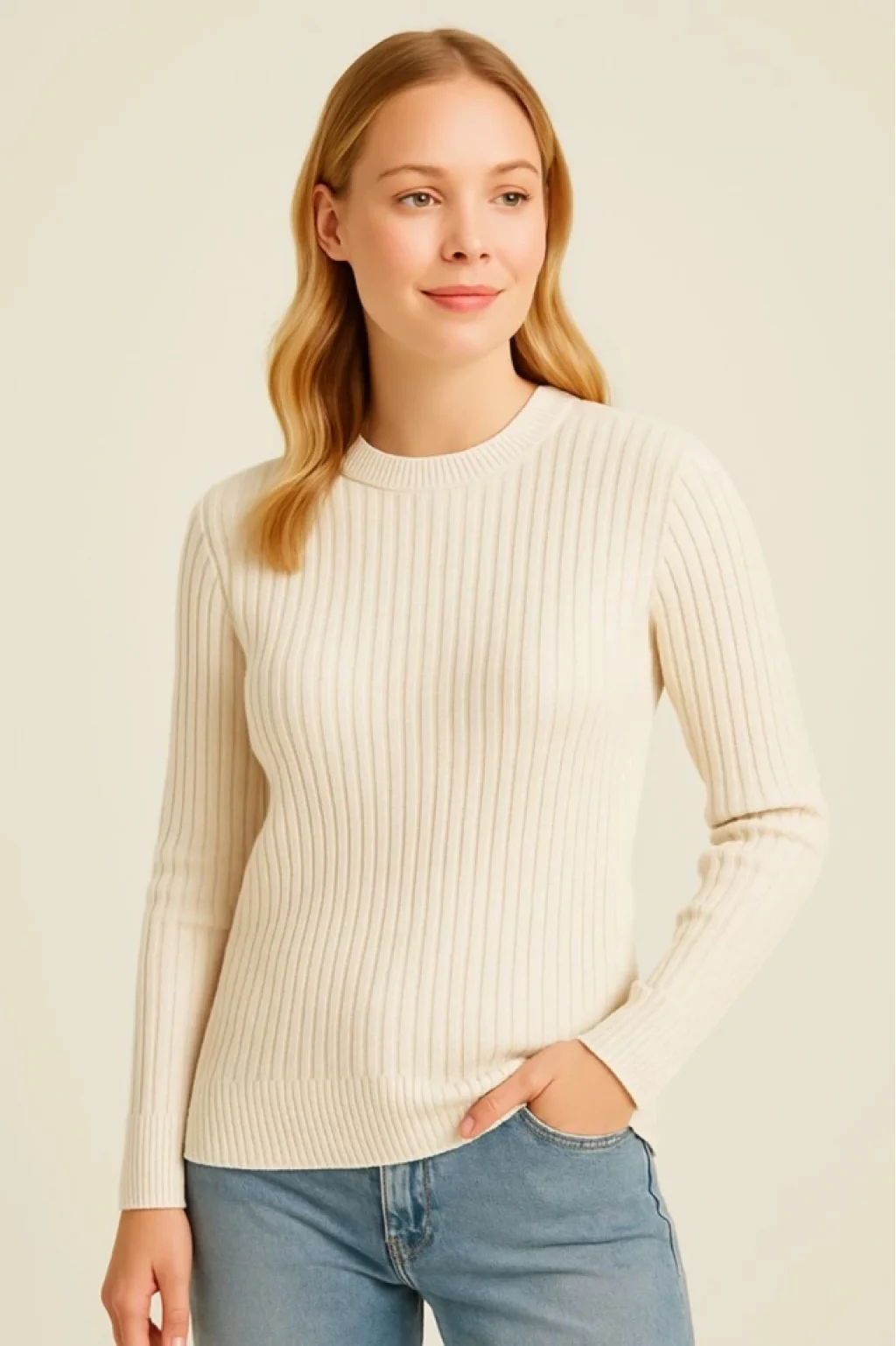 Bisiklet Yuvarlak Yaka Triko Kazak Pamuklu Kalın Fitilli Dokuma, Regular Fit Uzun Kollu Kışlık Model - Bej