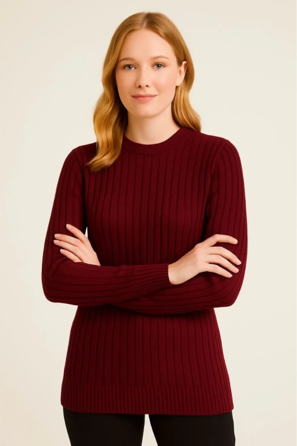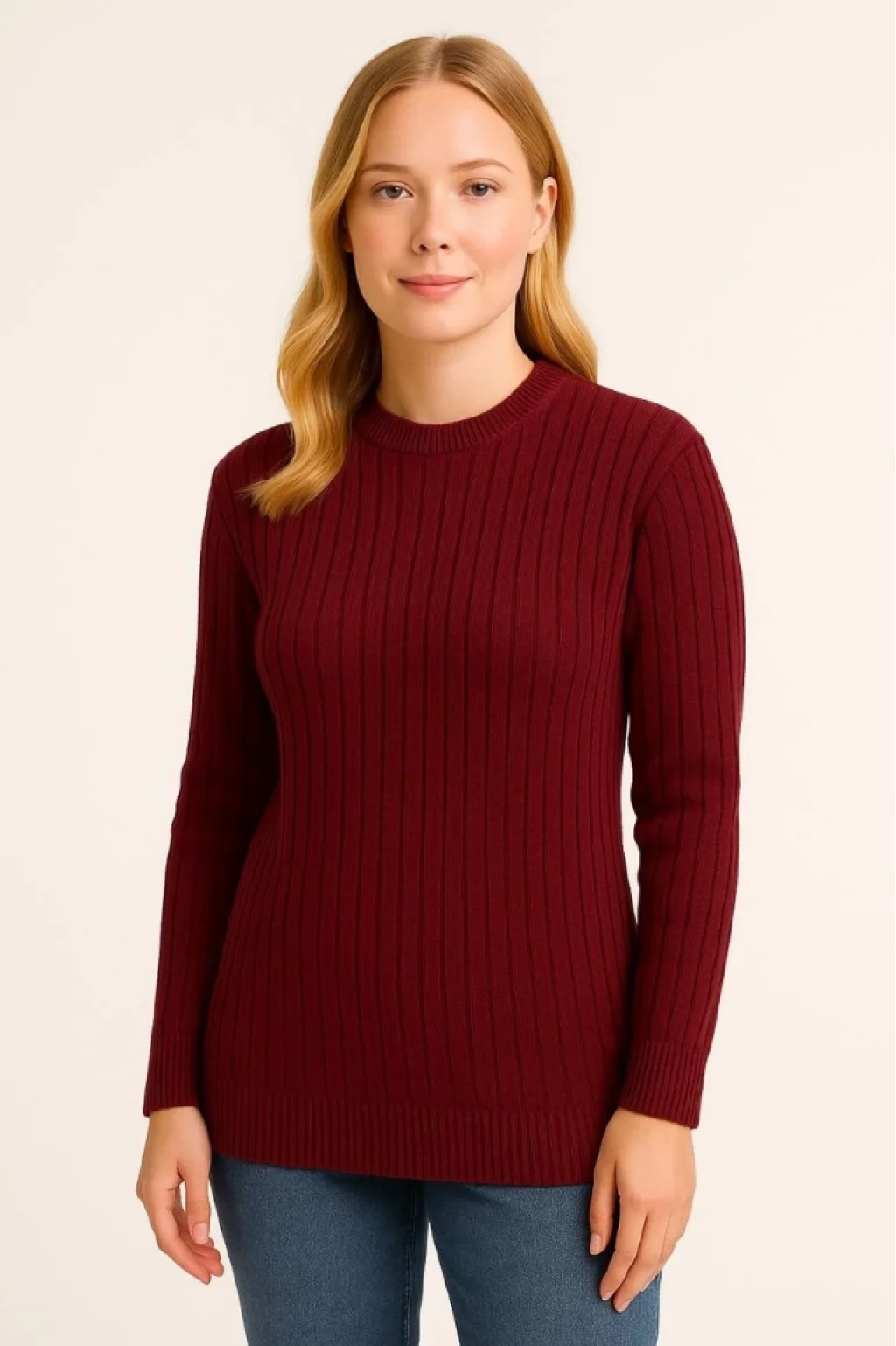 Bisiklet Yuvarlak Yaka Triko Kazak Pamuklu Kalın Fitilli Dokuma, Regular Fit Uzun Kollu Kışlık Model - Bordo