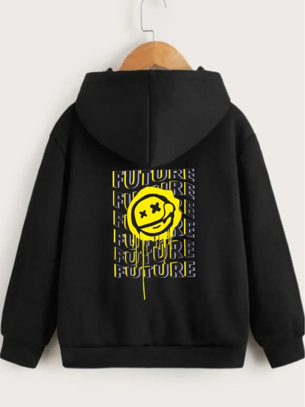 Çocuk Unisex Kapüşonlu Ön ve Arka Emoji Baskılı Sweatshirt - Siyah