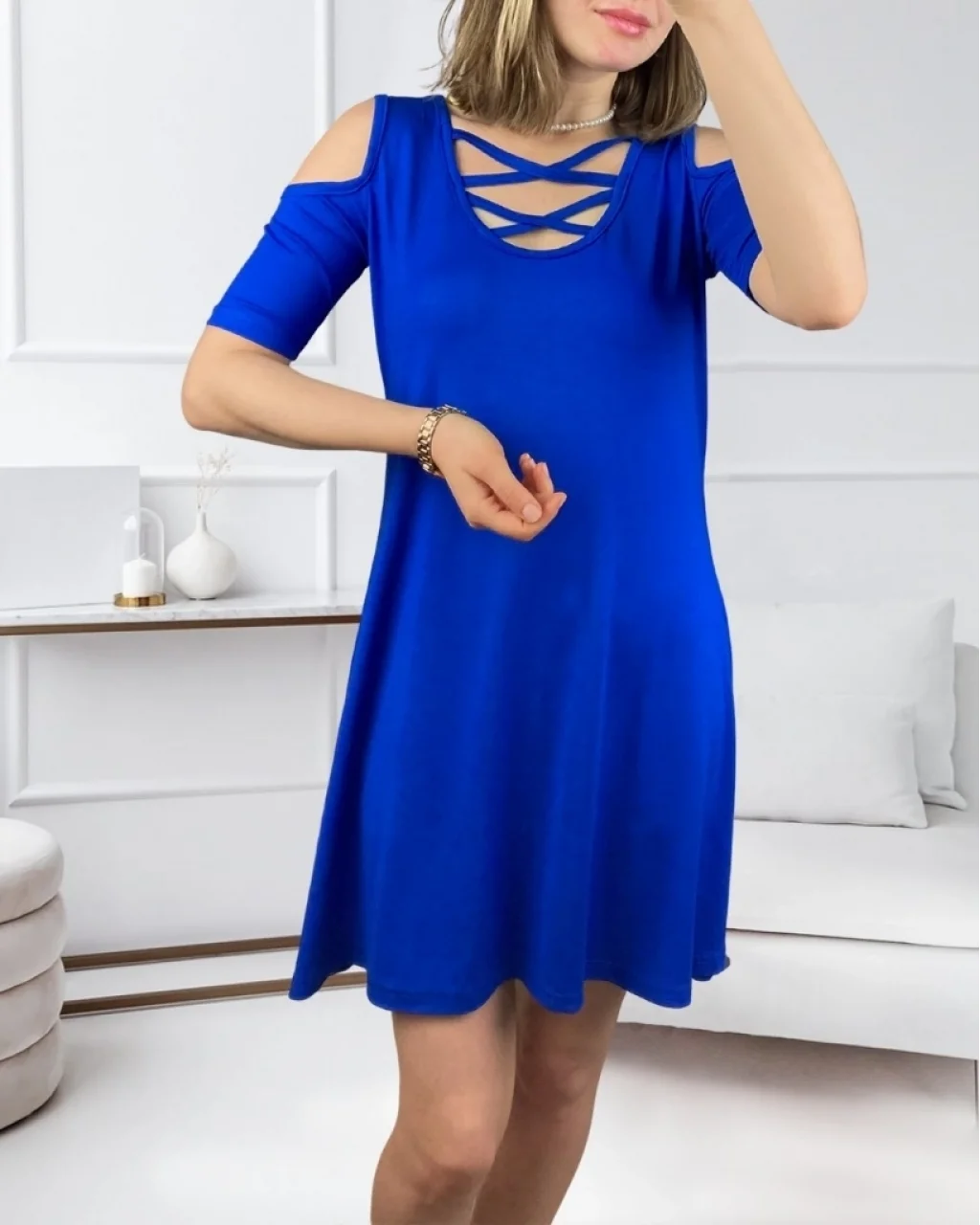 Dekolteli Bağcık Detay Viskon Kumaş Elbise