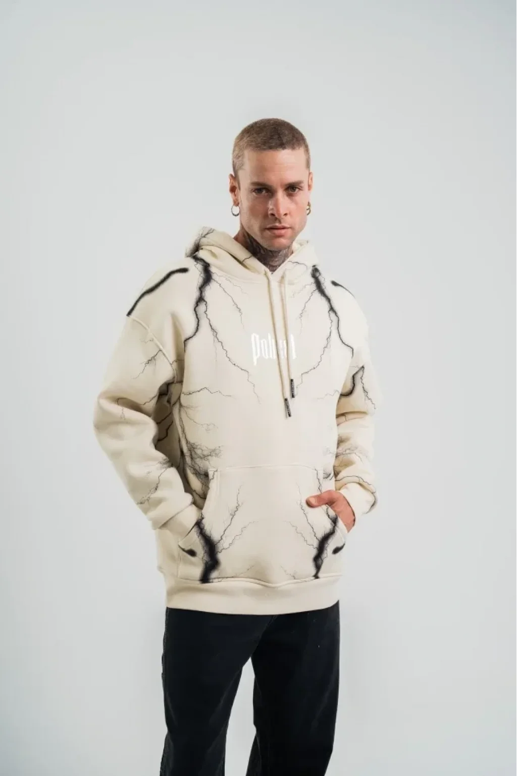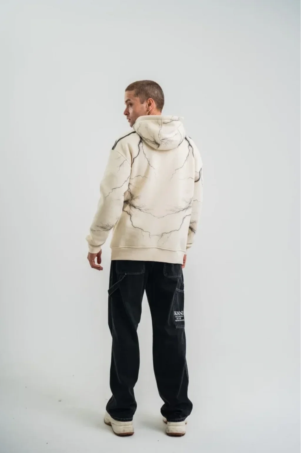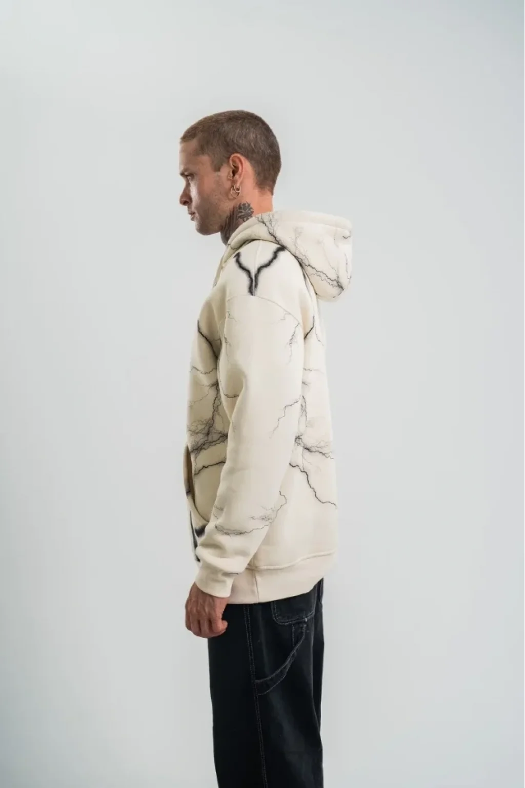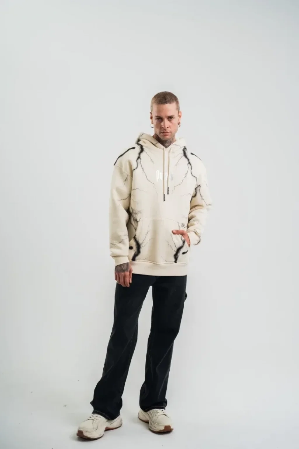 Double Oversize Kapşonlu Şimşek Pano Baskılı SweatShirt - Krem