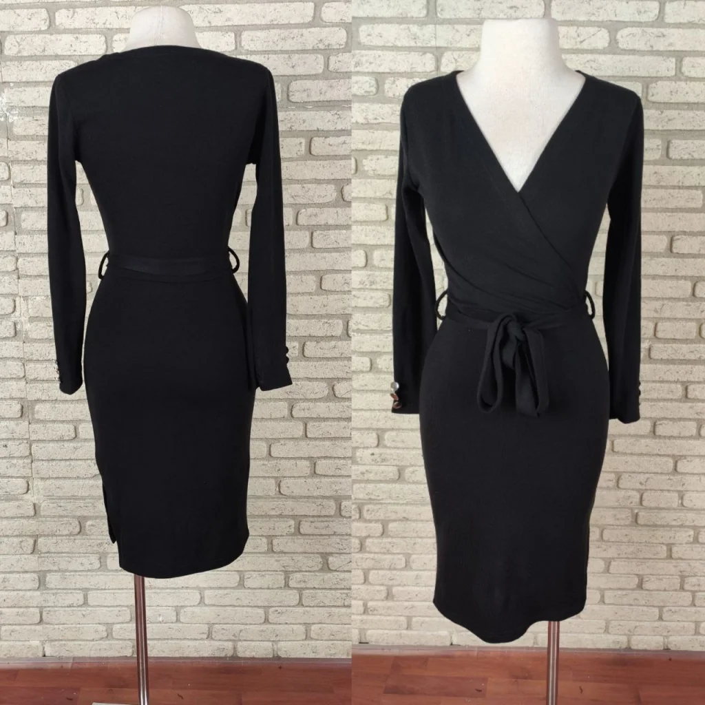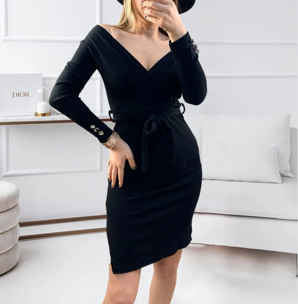 Düğme Detay Kuşaklı Yırtmaçlı Kruvaze Yaka Elbise