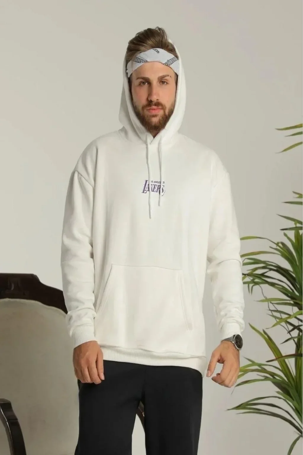 • Erkek 24 Sırt Baskılı Ovresize Üç İplik Kapüşonlu Sweatshirt - Beyaz