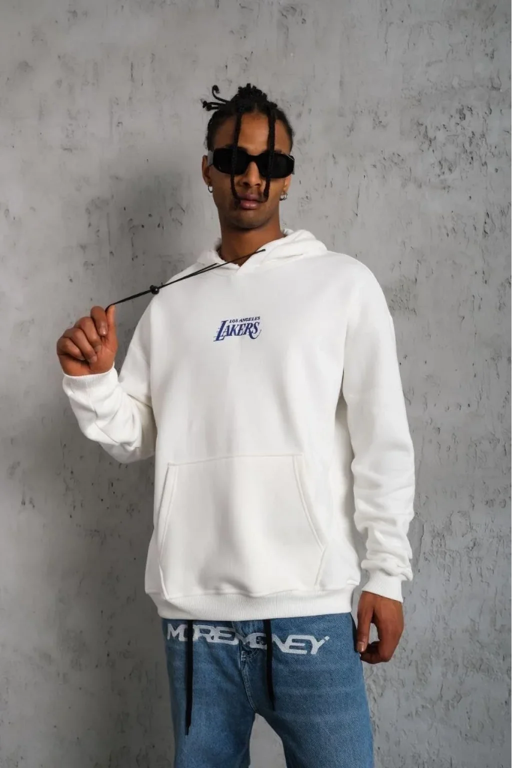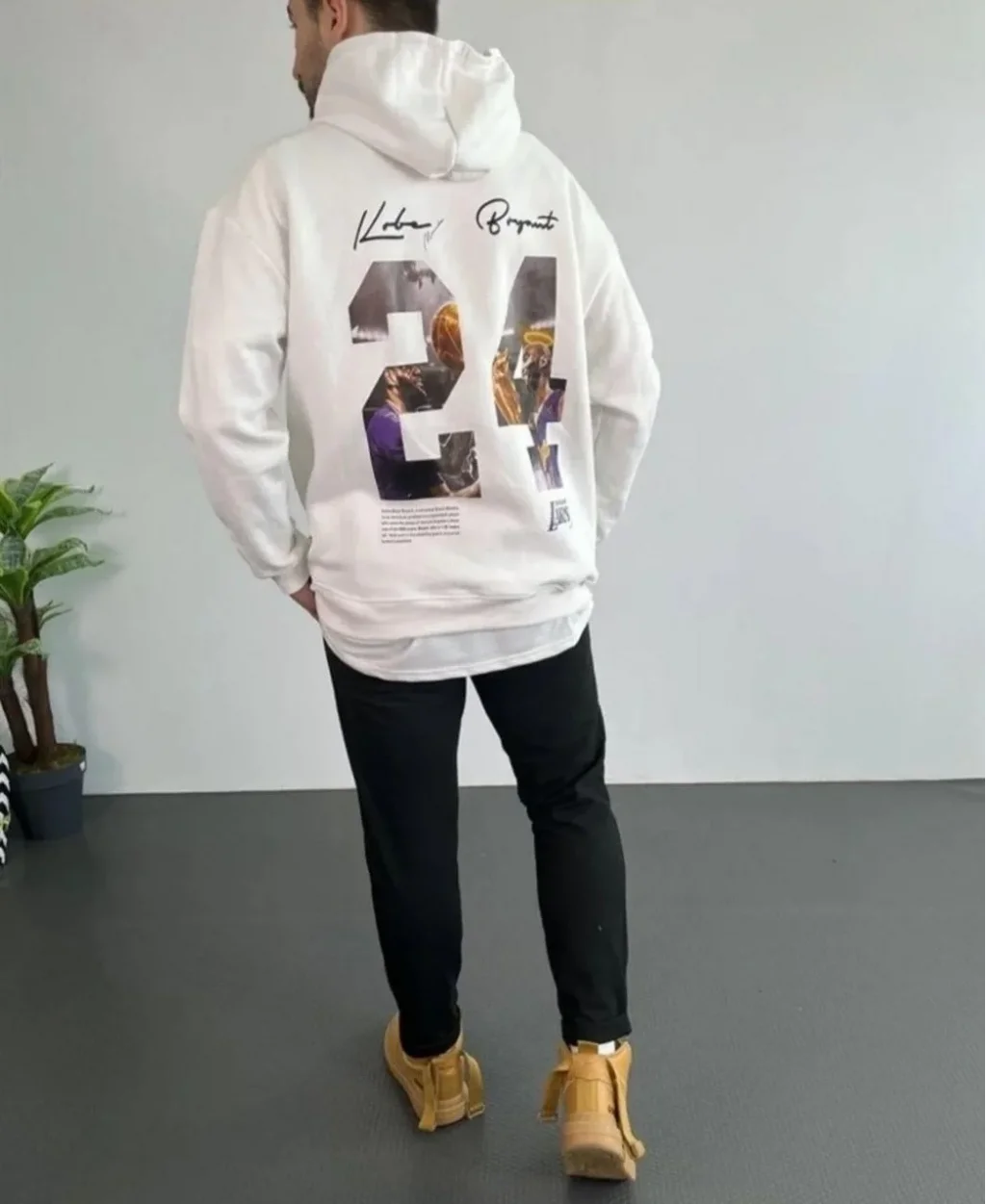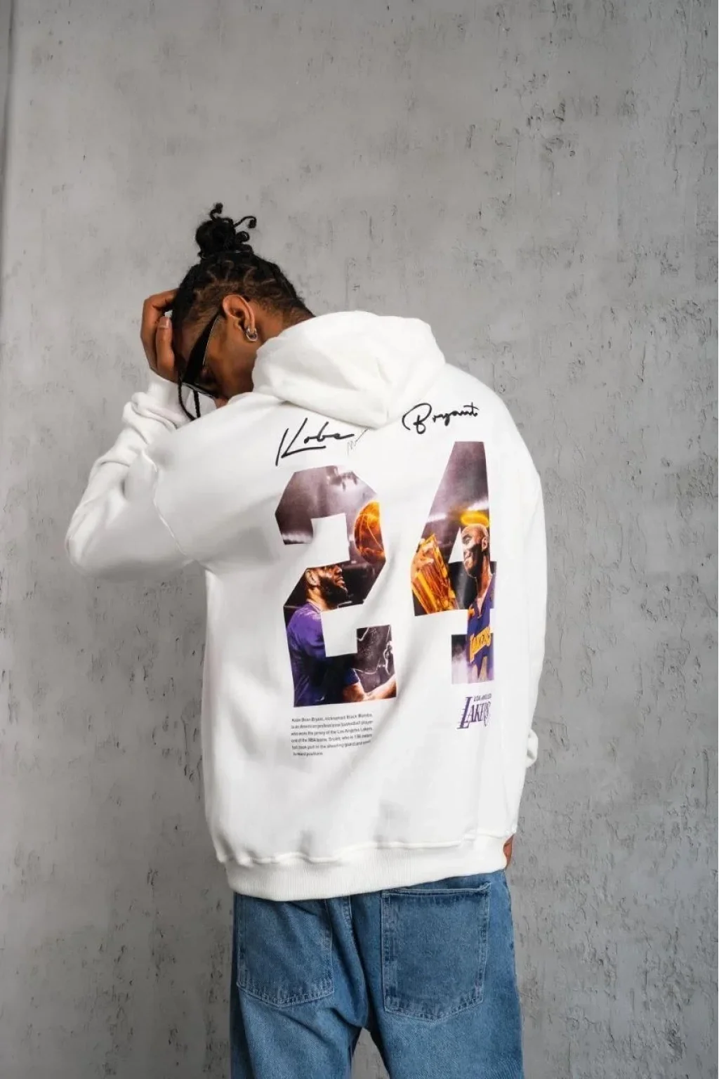 Erkek 24 Sırt Baskılı Ovresize Üç İplik Kapüşonlu Sweatshirt - Beyaz