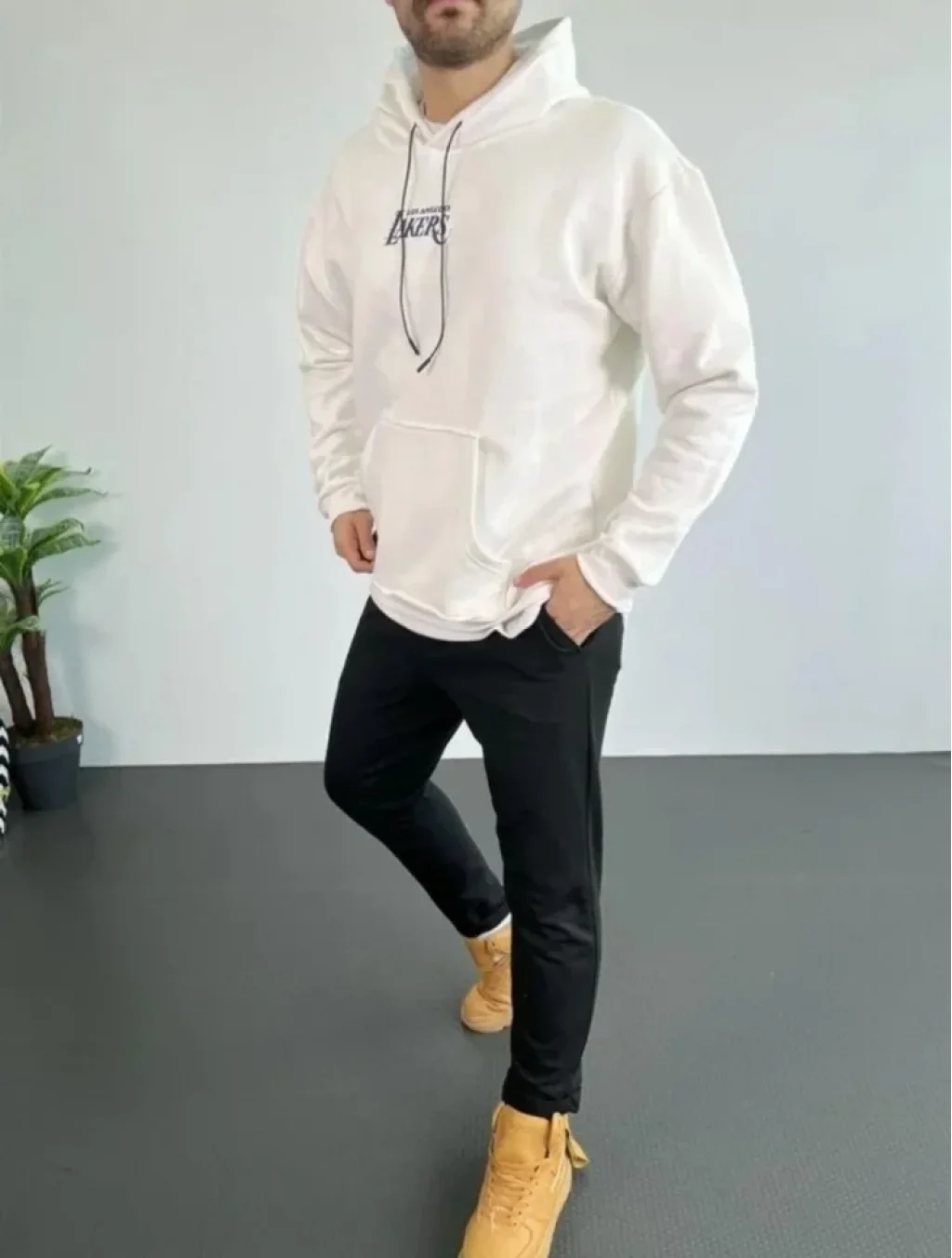Erkek 24 Sırt Baskılı Ovresize Üç İplik Kapüşonlu Sweatshirt - Beyaz