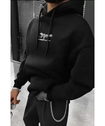 Uzun Kol Kapşonlu Göğüs Baskılı SweatShirt - Siyah