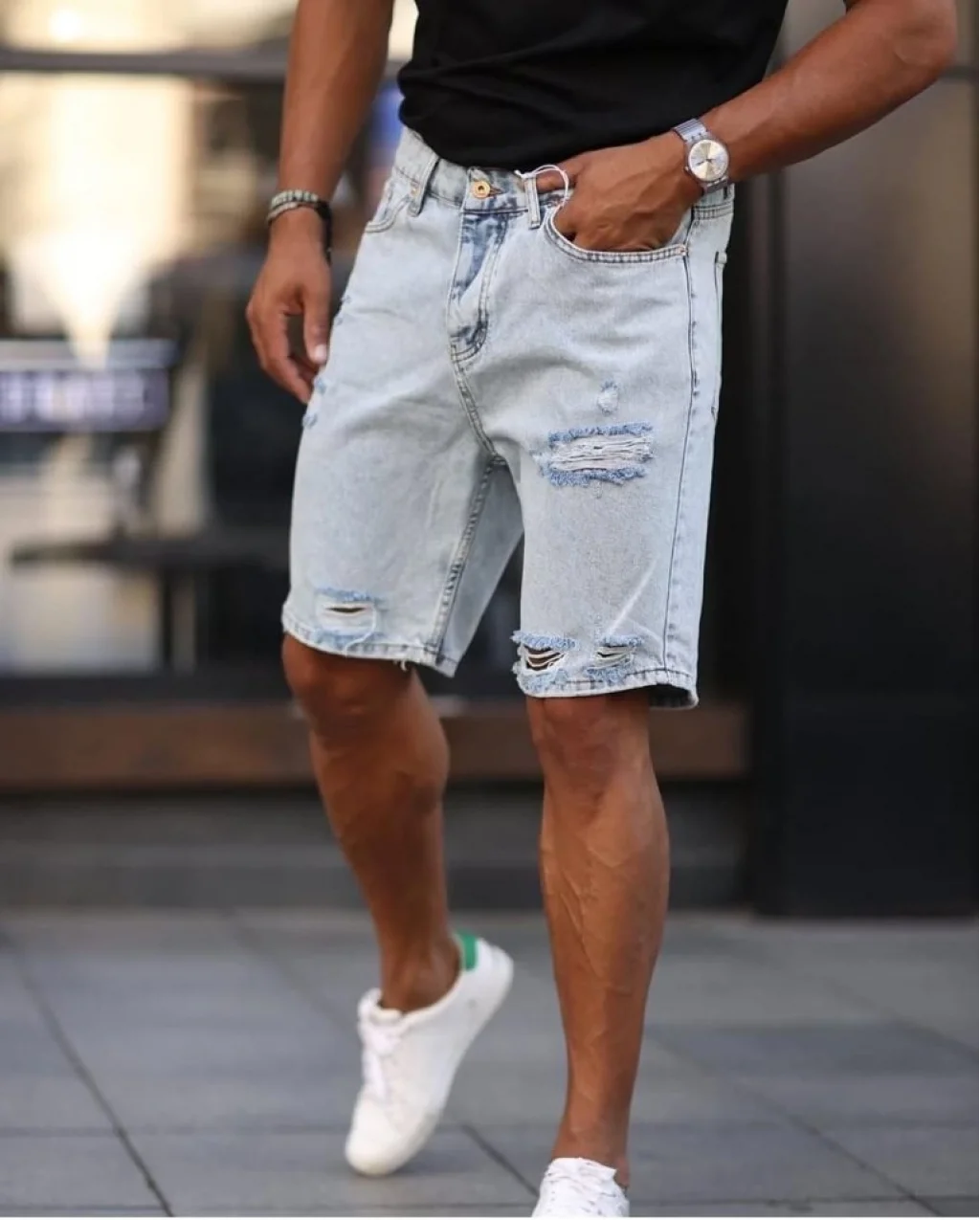 Erkek Açık Mavi Detaylı Kot Şort