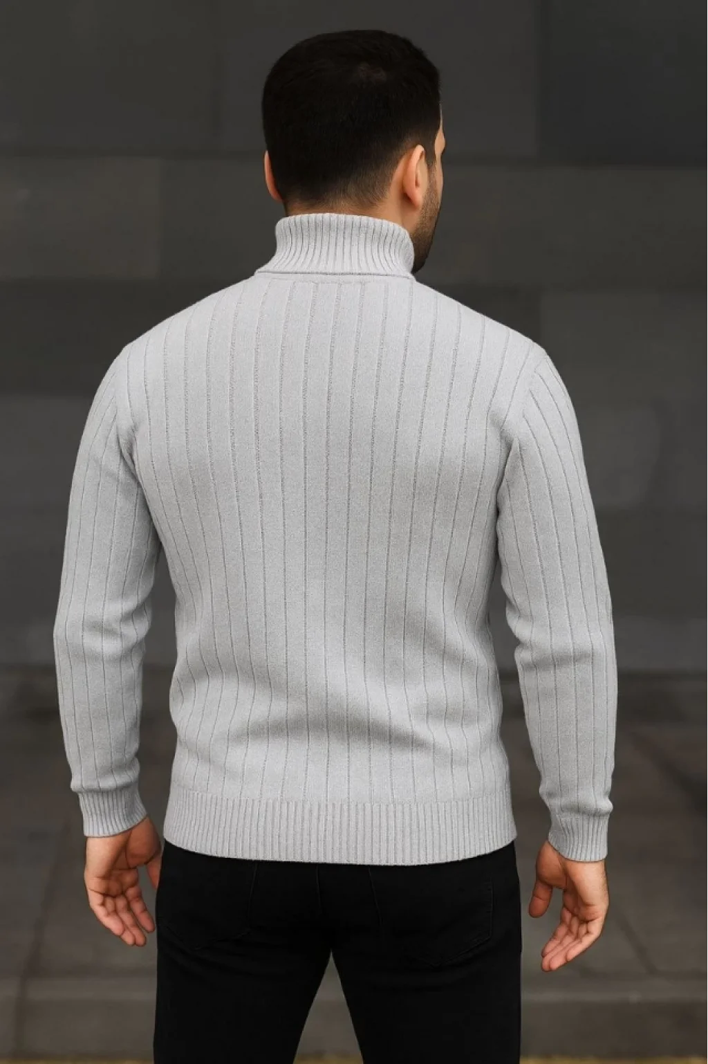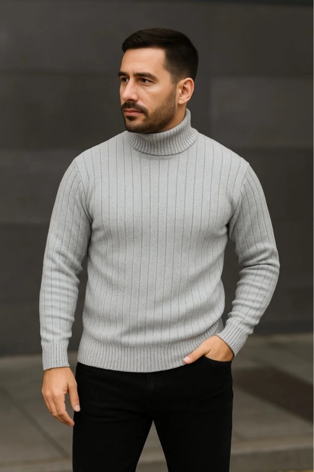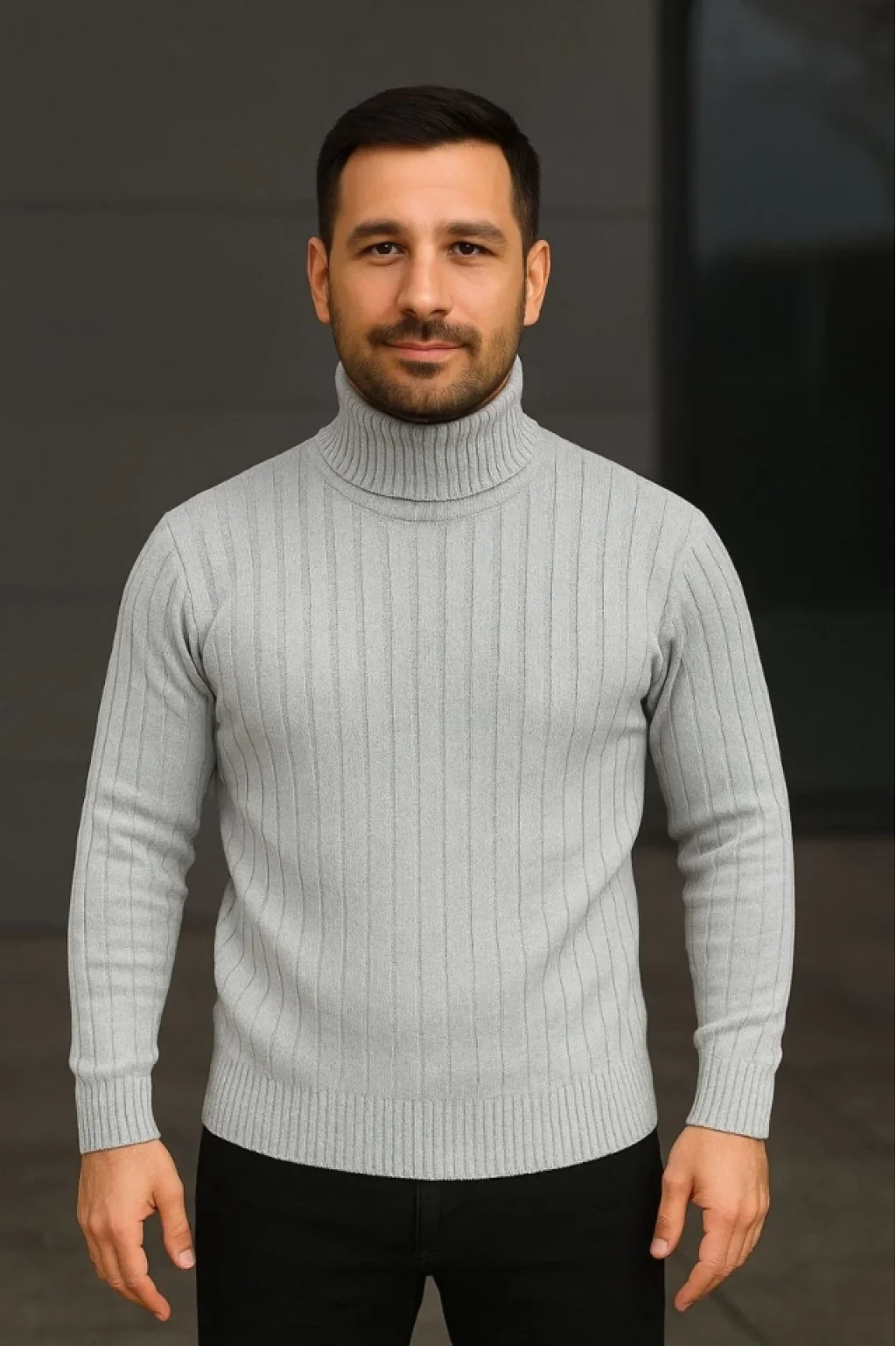 Erkek Balıkcı Yaka Bağazlı Triko Kazak Pamuklu Kalın Fitilli Dokuma, Regular Fit Uzun Kollu Kışlık Model - Gri