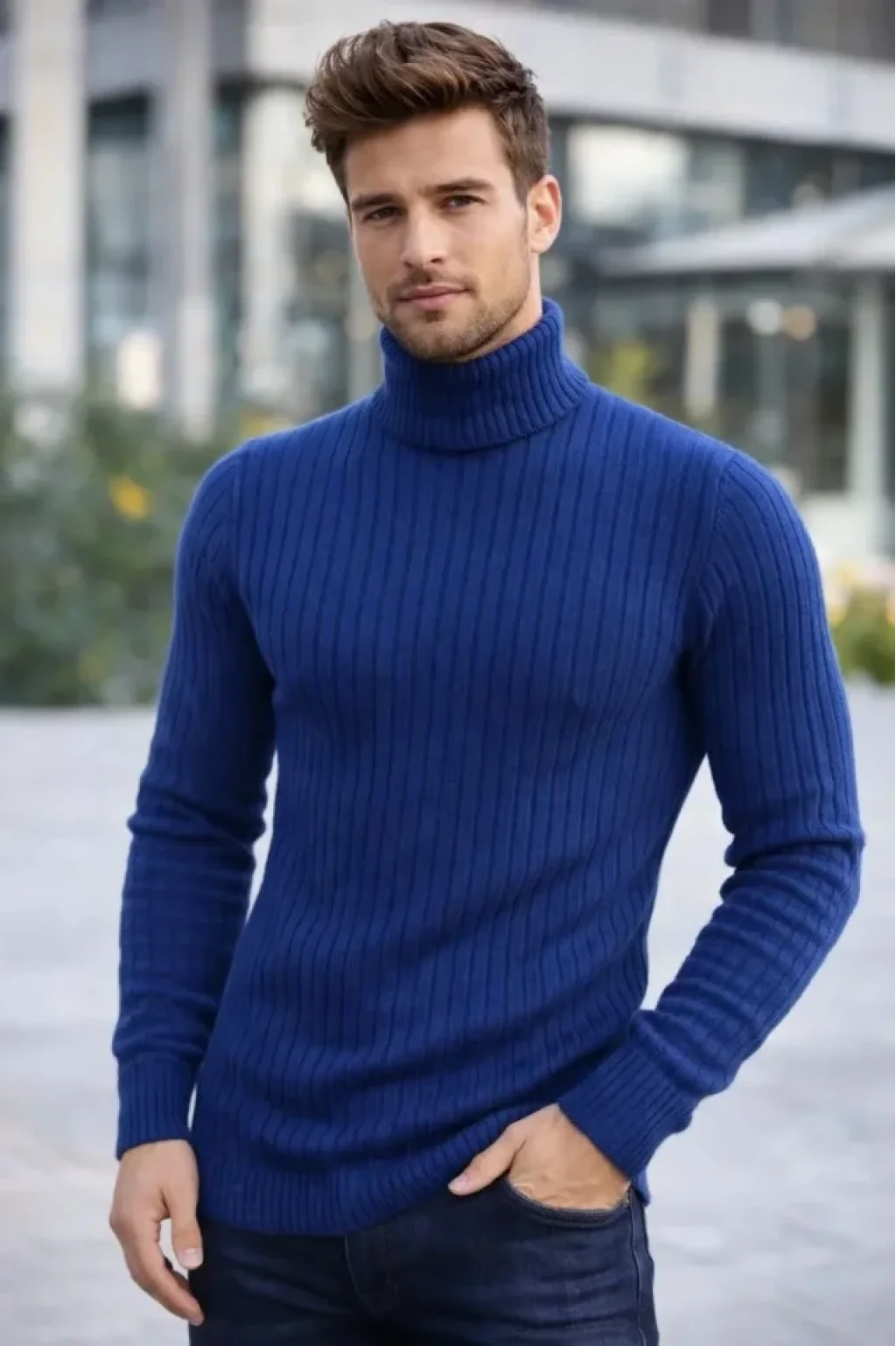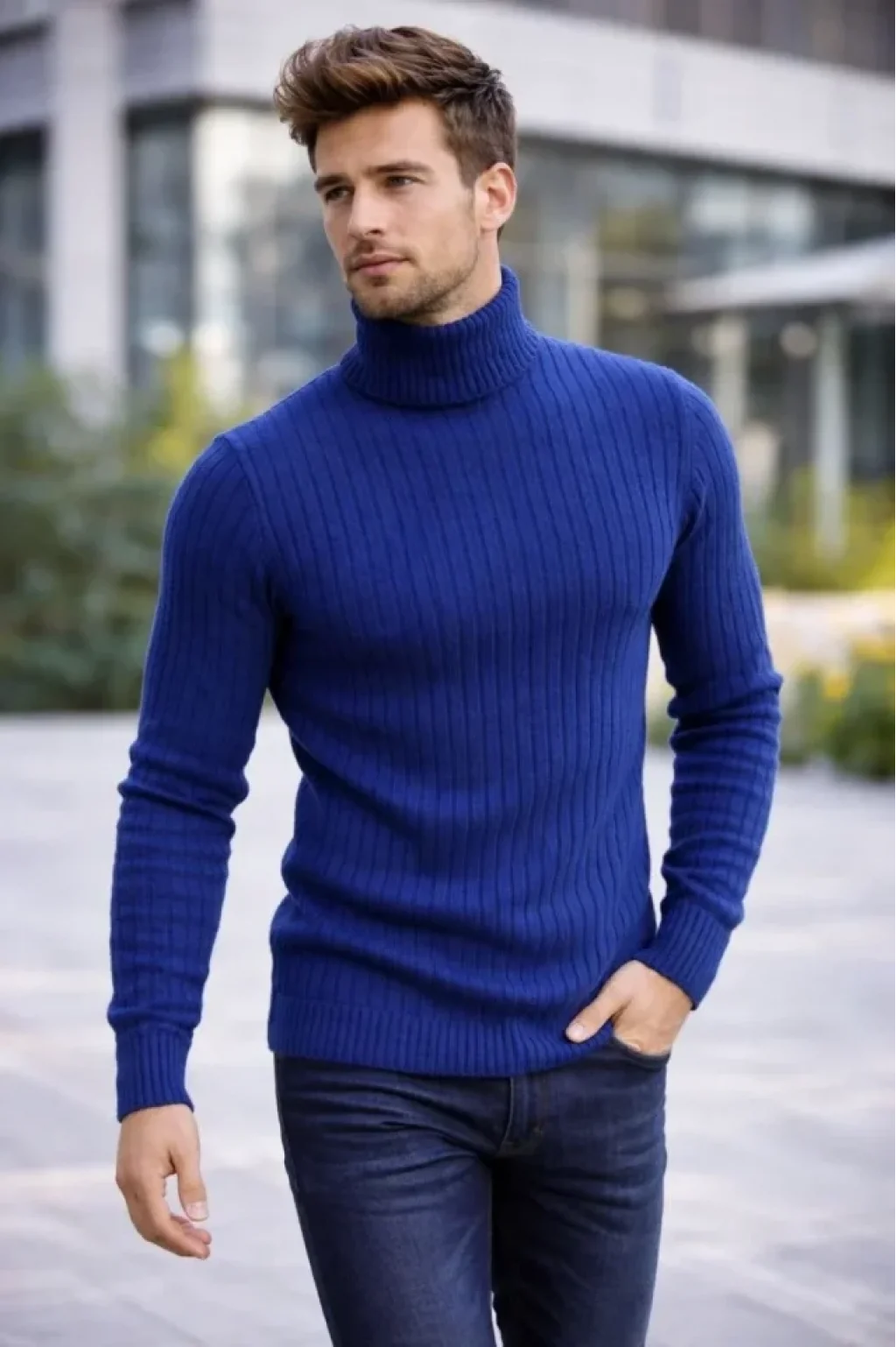 Erkek Balıkcı Yaka Bağazlı Triko Kazak Pamuklu Kalın Fitilli Dokuma, Regular Fit Uzun Kollu Kışlık Model - İndigo