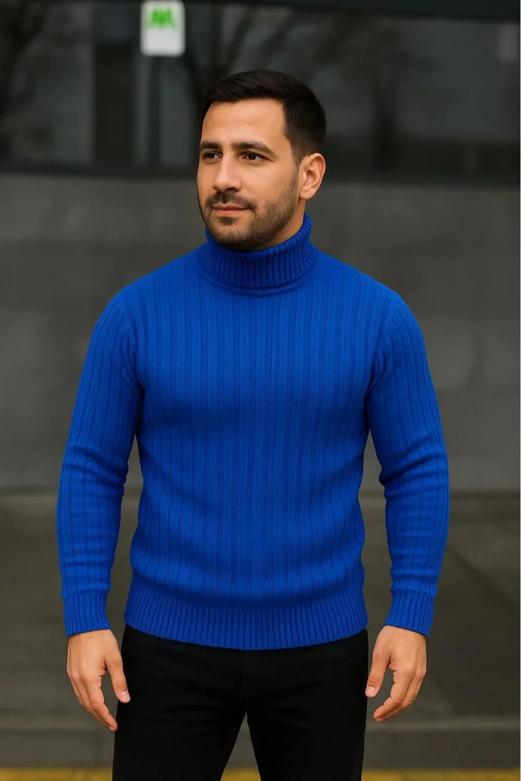 Erkek Balıkcı Yaka Bağazlı Triko Kazak Pamuklu Kalın Fitilli Dokuma, Regular Fit Uzun Kollu Kışlık Model - Saks Mavisi