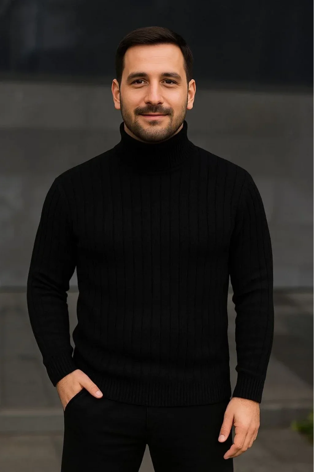 Erkek Balıkcı Yaka Bağazlı Triko Kazak Pamuklu Kalın Fitilli Dokuma, Regular Fit Uzun Kollu Kışlık Model - Siyah