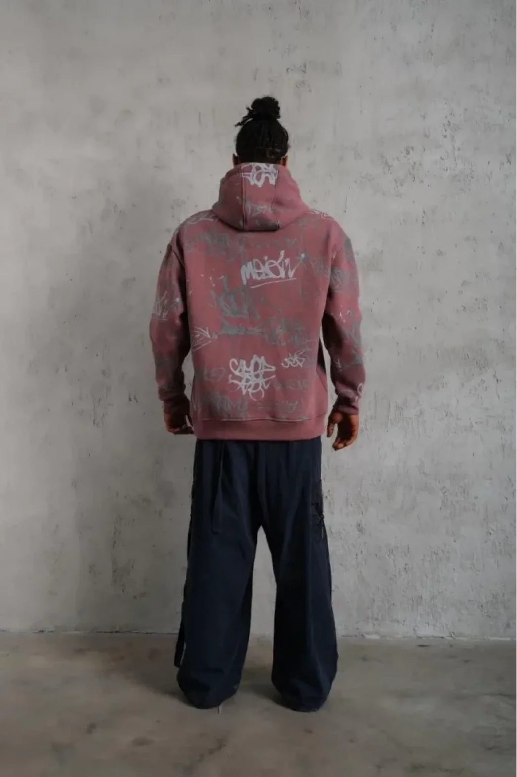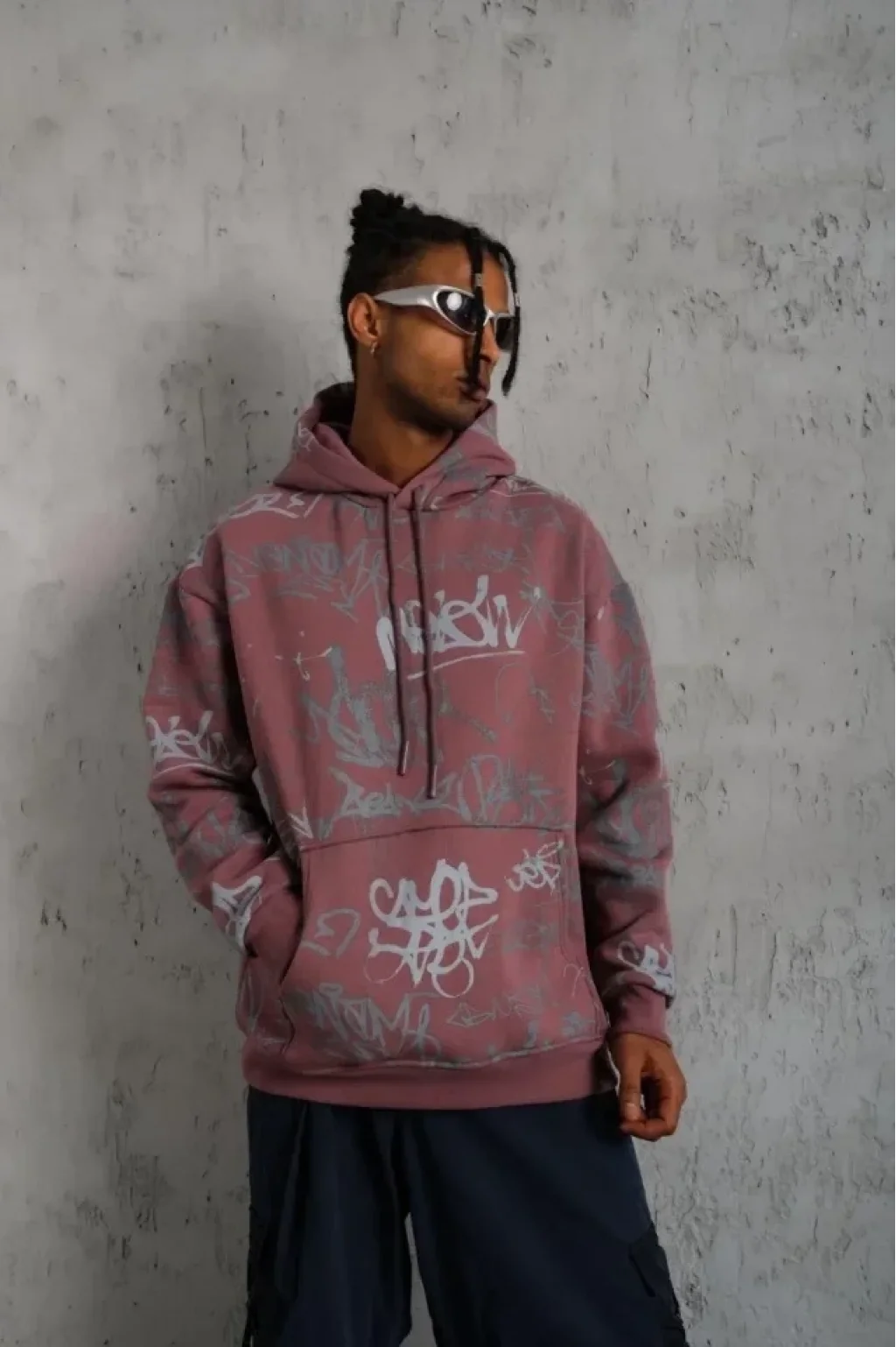 Erkek Baskılı Kapüşonlu Ribanalı Sweat - Gül Kurusu