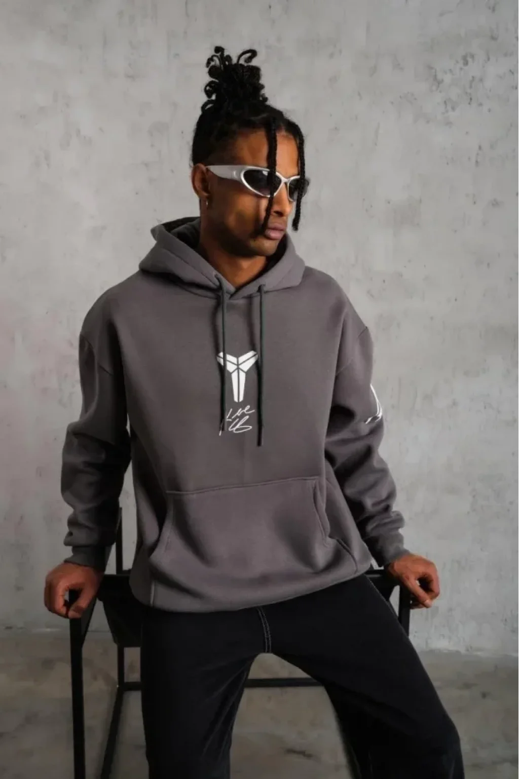Erkek Baskılı Kapüşonlu Sweat - Gri