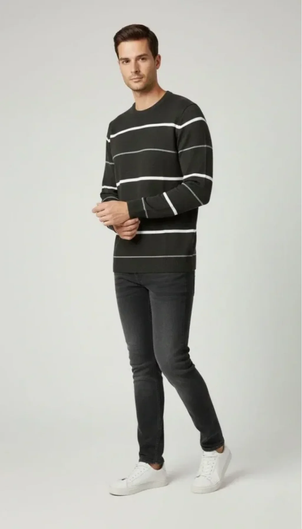 Erkek Bisiklet Yaka Cizgili Triko Kazak Yumuşak Dokulu Pamuklu Ince Dokuma, Uzun Kollu Rahat Regular Kalıp - Füme