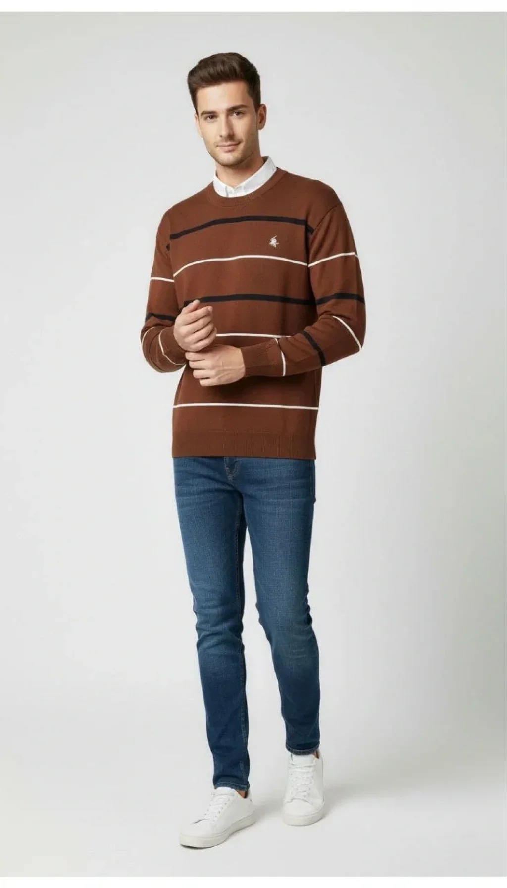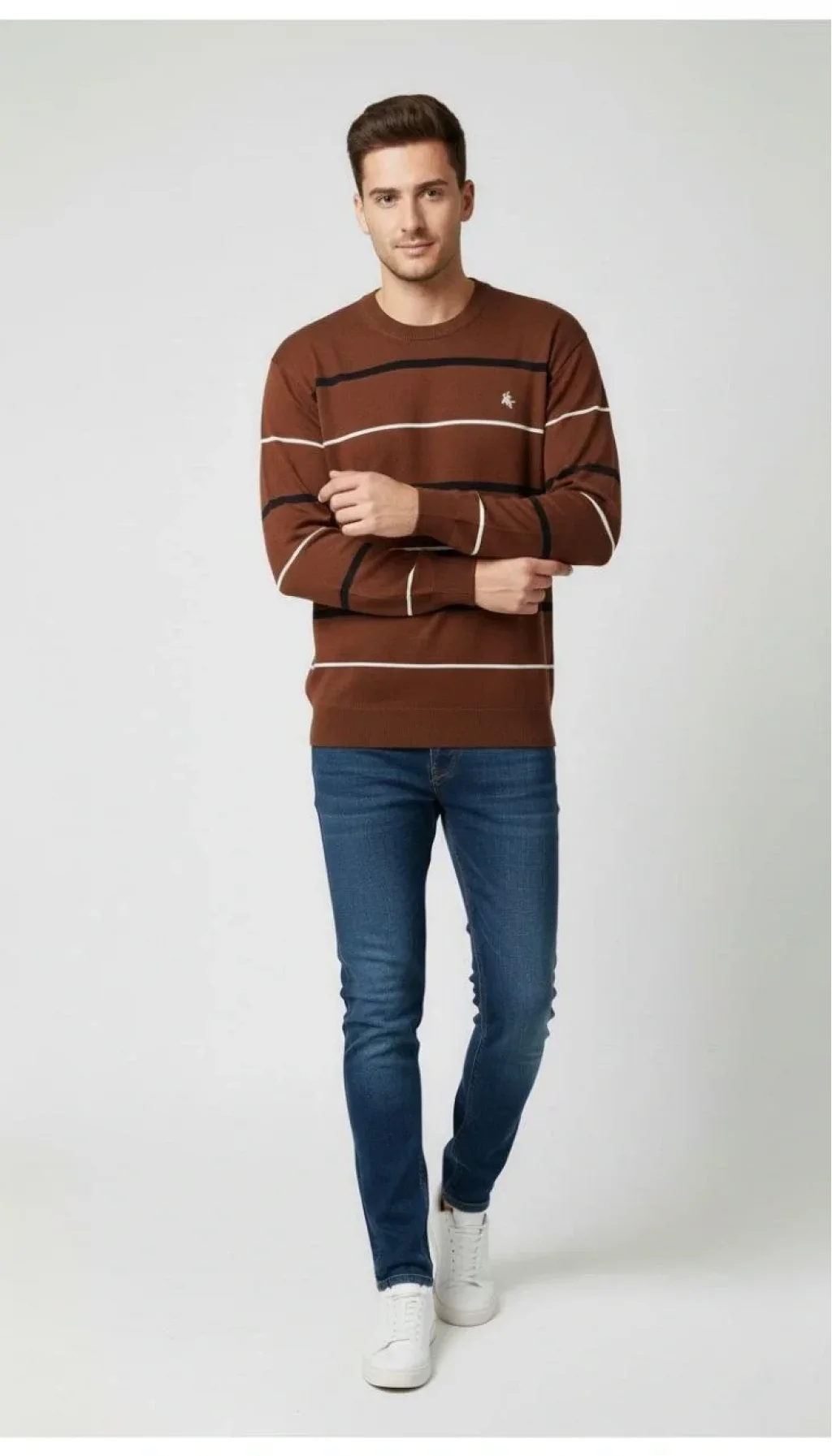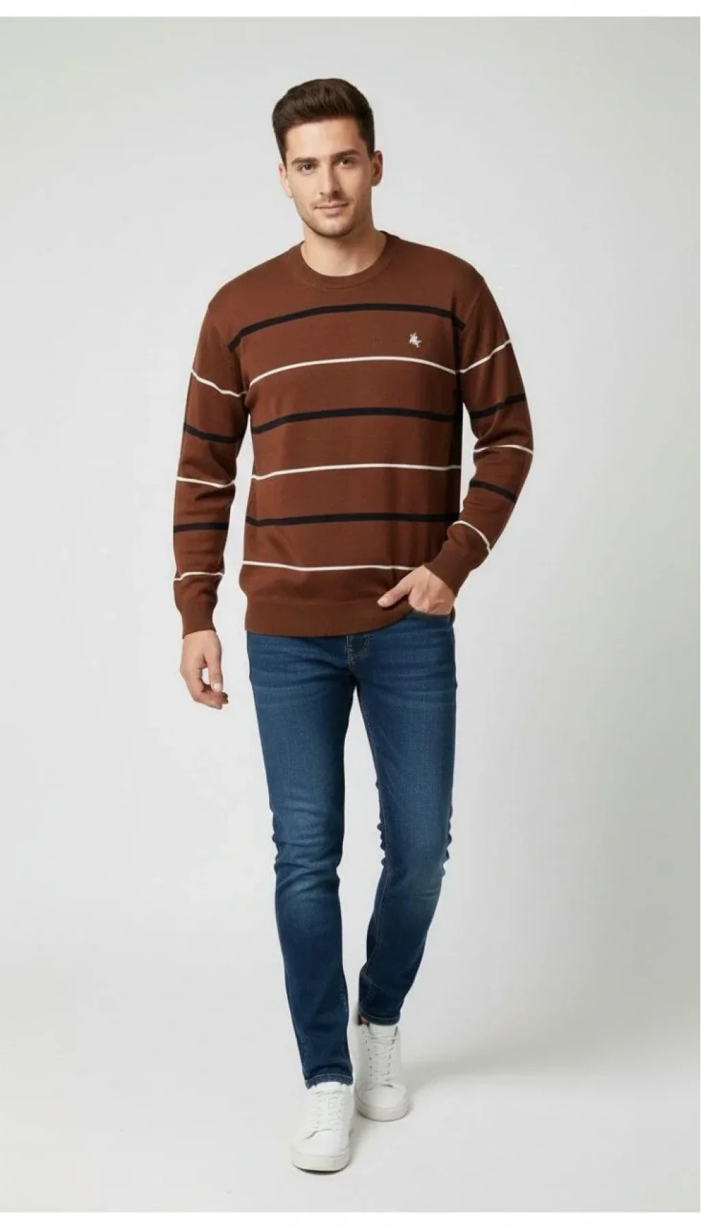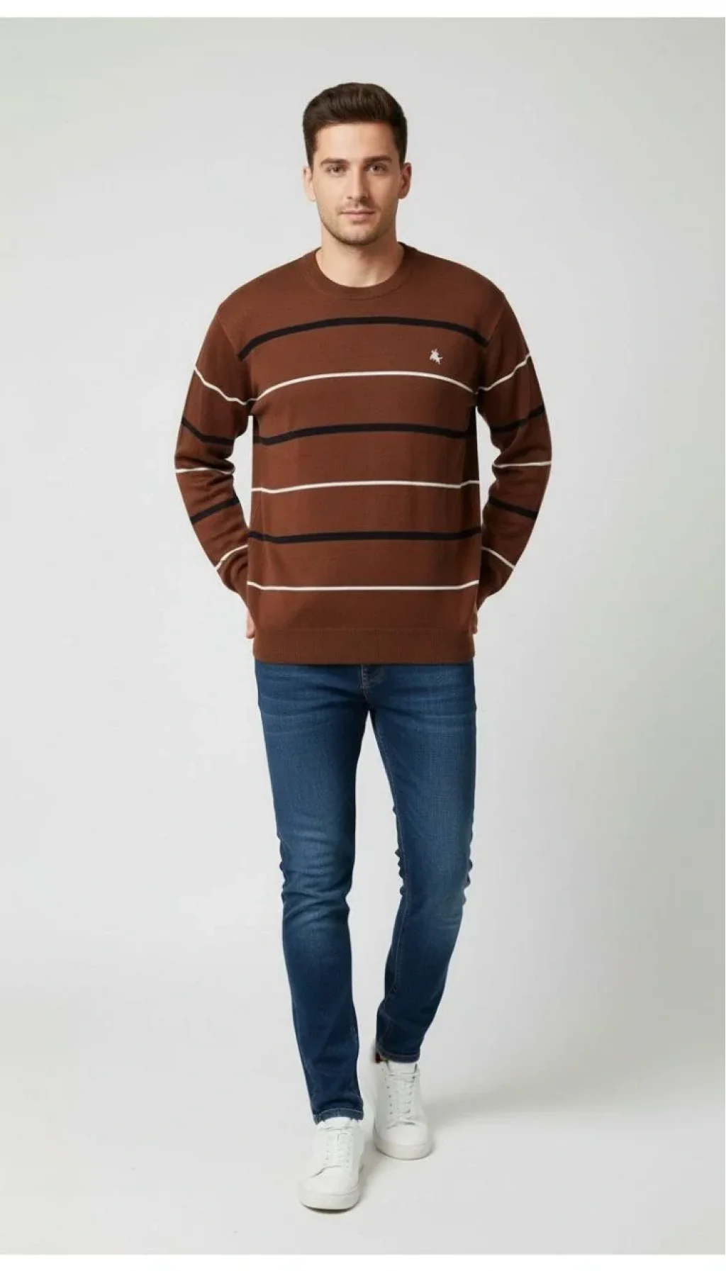 Erkek Bisiklet Yaka Cizgili Triko Kazak yumuşak dokulu Pamuklu ince Dokuma, uzun kollu Rahat Regular kalıp - Kahverengi