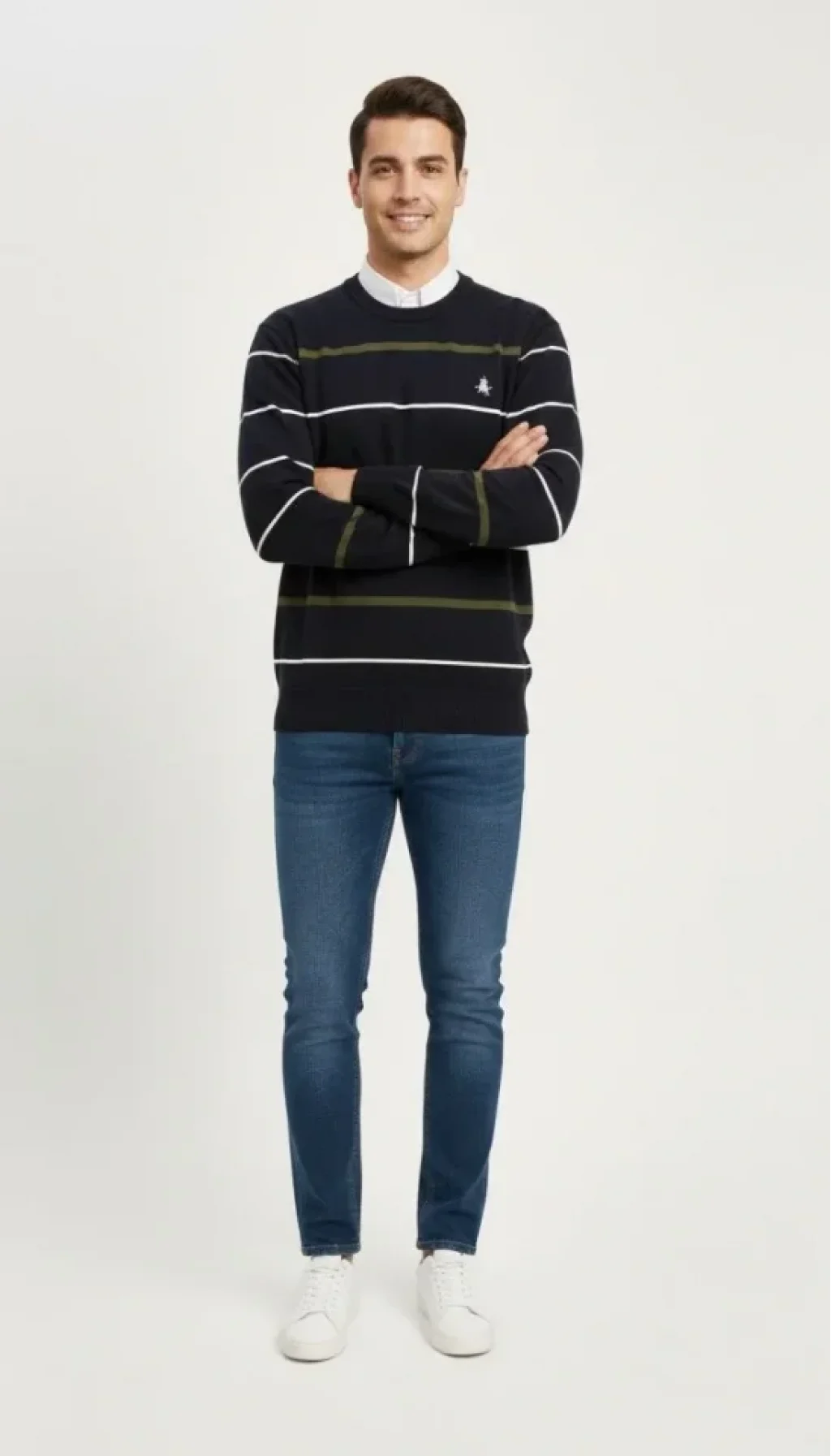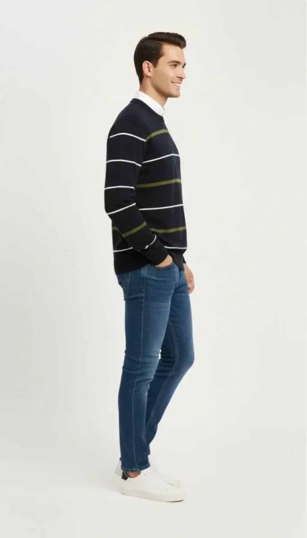 Erkek Bisiklet Yaka Cizgili Triko Kazak Yumuşak Dokulu Pamuklu Ince Dokuma, Uzun Kollu Rahat Regular Kalıp - Lacivert