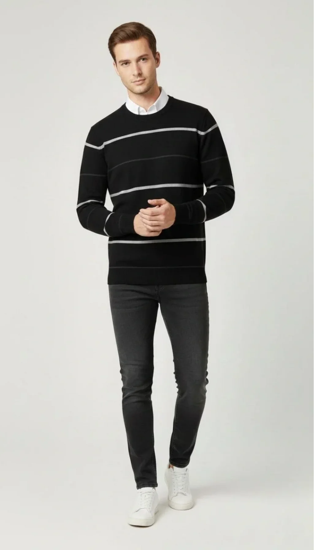 Erkek Bisiklet Yaka Cizgili Triko Kazak yumuşak dokulu Pamuklu ince Dokuma, uzun kollu Rahat Regular kalıp - Siyah