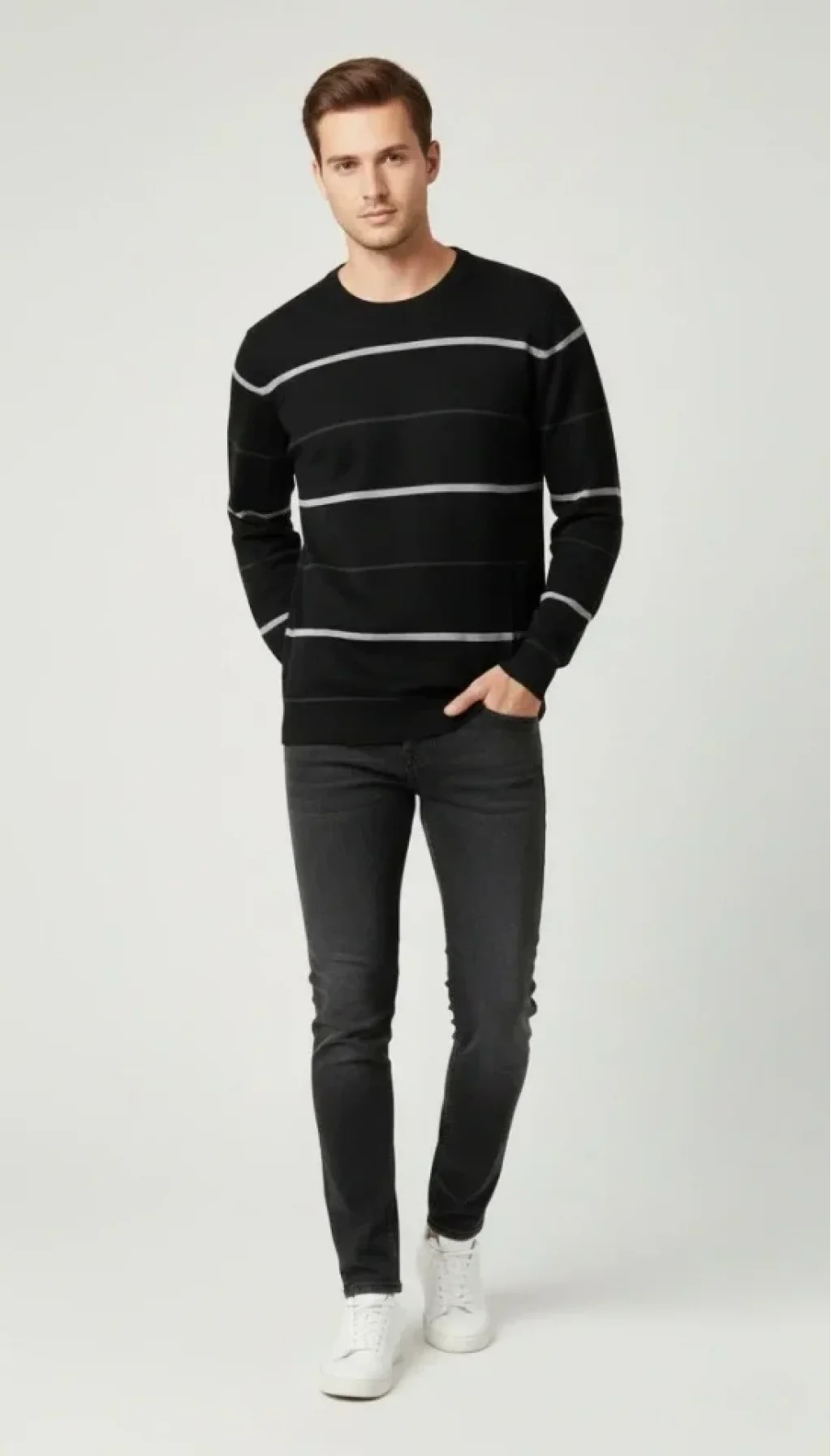 Erkek Bisiklet Yaka Cizgili Triko Kazak Yumuşak Dokulu Pamuklu Ince Dokuma, Uzun Kollu Rahat Regular Kalıp - Siyah