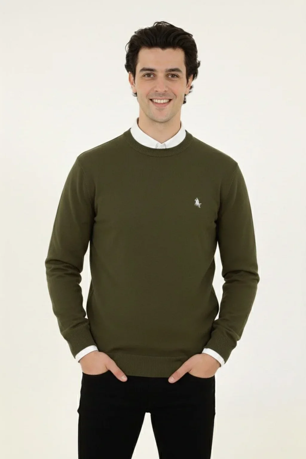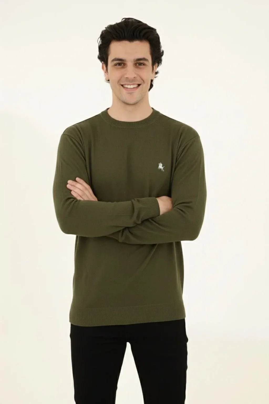 Erkek Bisiklet Yaka Nakış işlemeli Triko Kazak yumuşak dokulu Pamuklu ince Dokuma, uzun kollu Rahat Regular kalıp - Haki