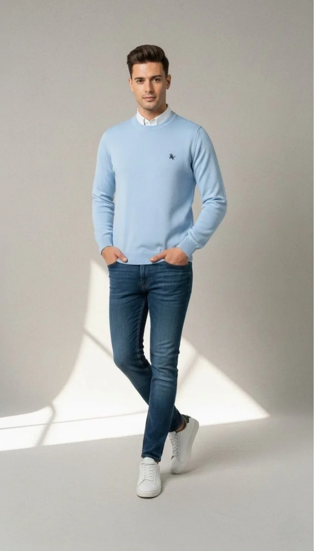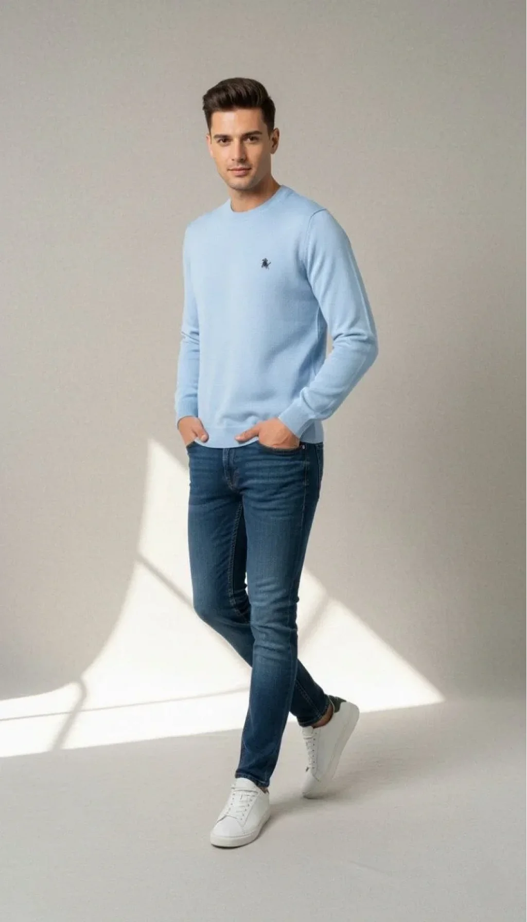 Erkek Bisiklet Yaka Nakış işlemeli Triko Kazak yumuşak dokulu Pamuklu ince Dokuma, uzun kollu Rahat Regular kalıp - Mavi