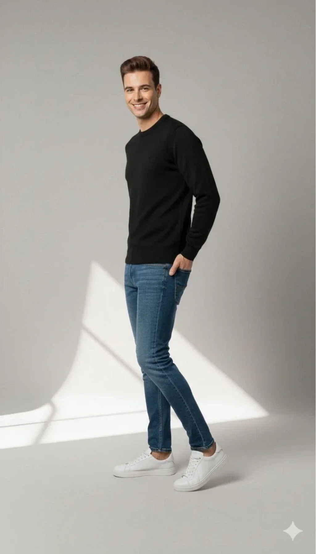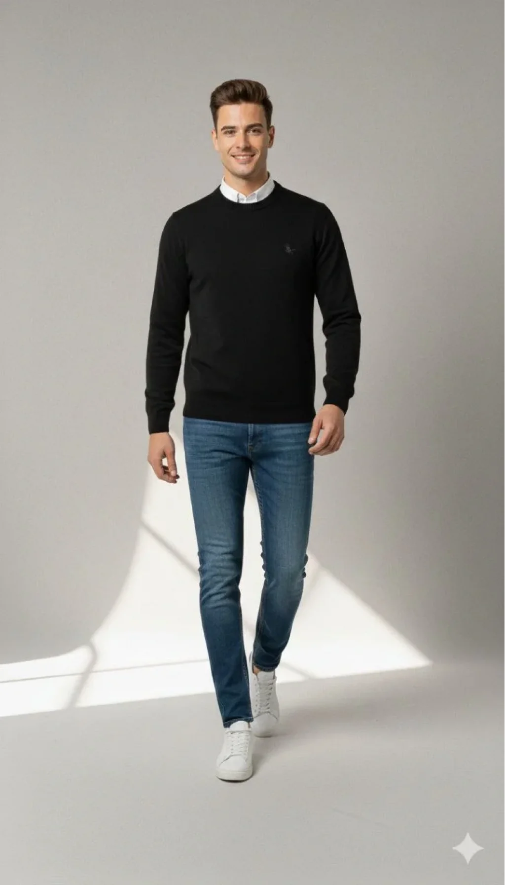 Erkek Bisiklet Yaka Nakış işlemeli Triko Kazak yumuşak dokulu Pamuklu ince Dokuma, uzun kollu Rahat Regular kalıp - Siyah