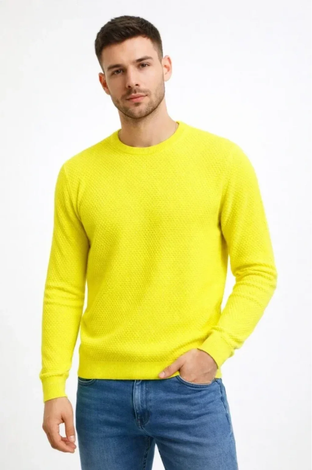 Erkek Bisiklet Yaka Petekli Dokulu Triko Kazak Pamuklu Ince Dokuma, Uzun Kollu Rahat Regular Kalıp - Sarı