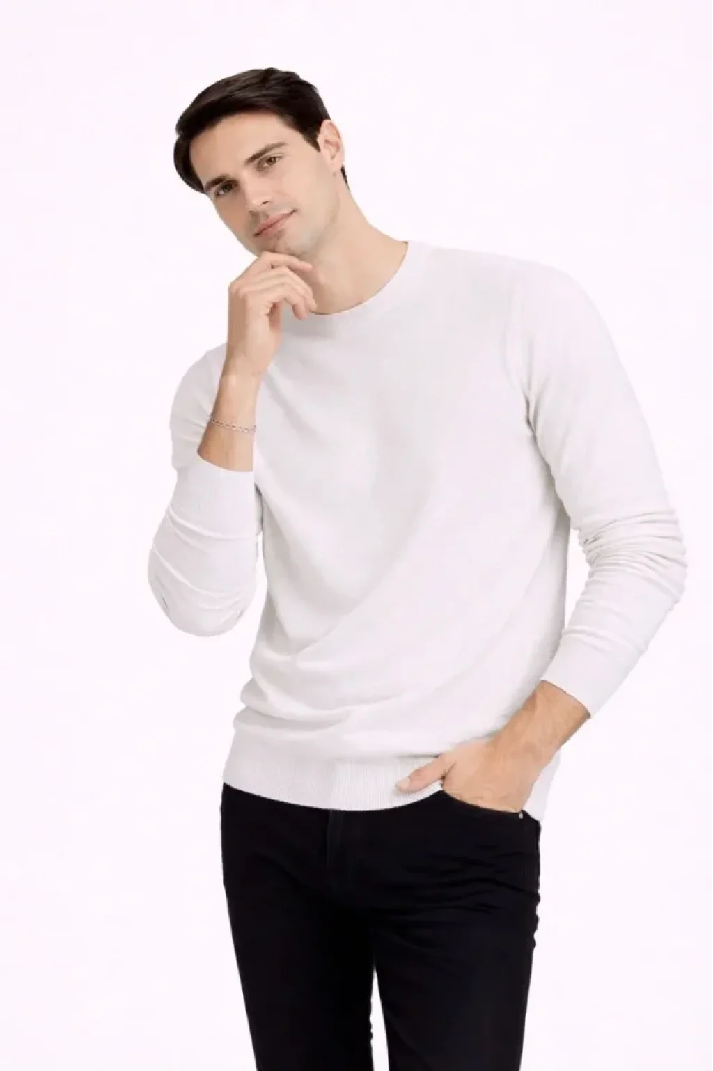 Erkek Bisiklet Yaka Triko Kazak Yumuşak Dokulu Pamuklu Ince Dokuma, Uzun Kollu Rahat Regular Kalıp - Beyaz