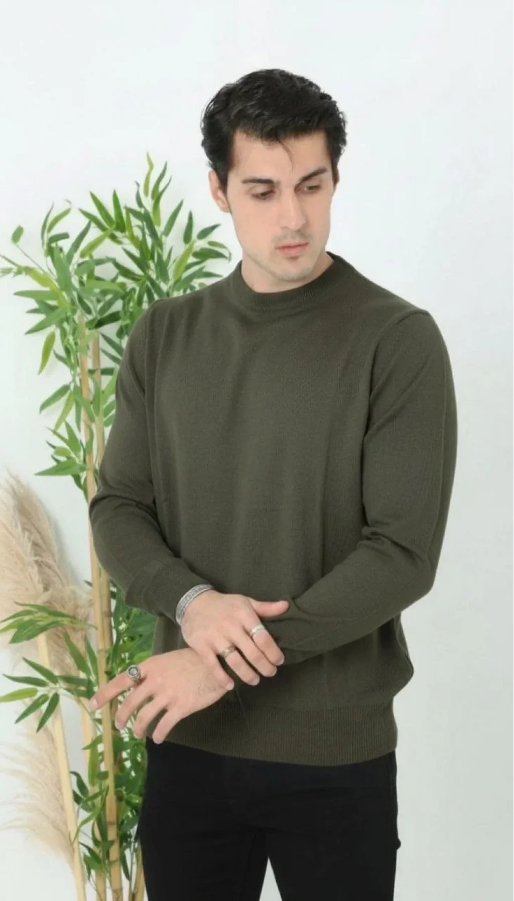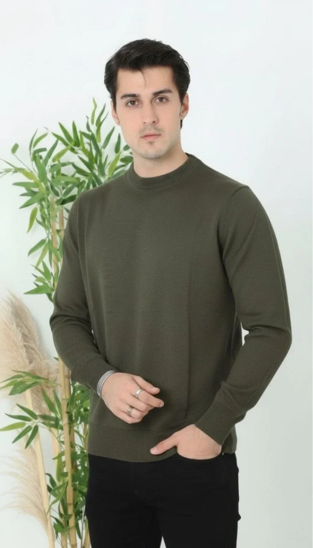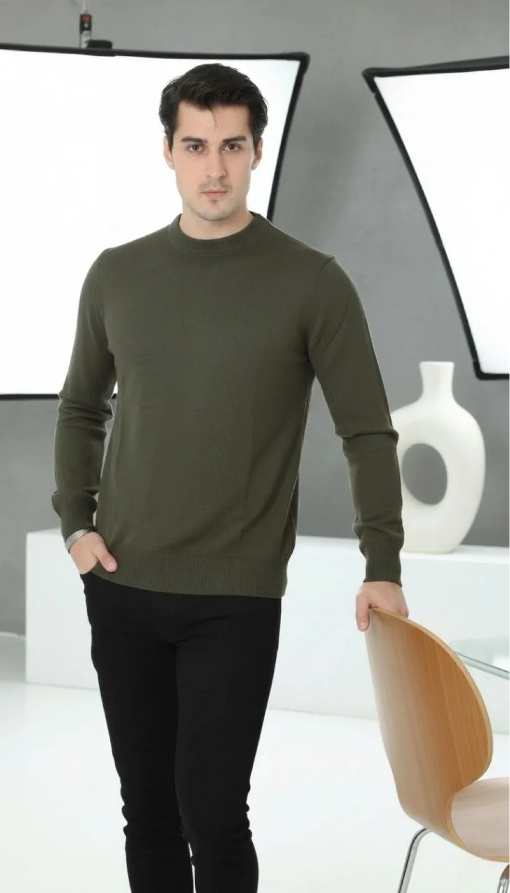Erkek Bisiklet Yaka Triko Kazak yumuşak dokulu Pamuklu ince Dokuma, uzun kollu Rahat Regular kalıp - Haki