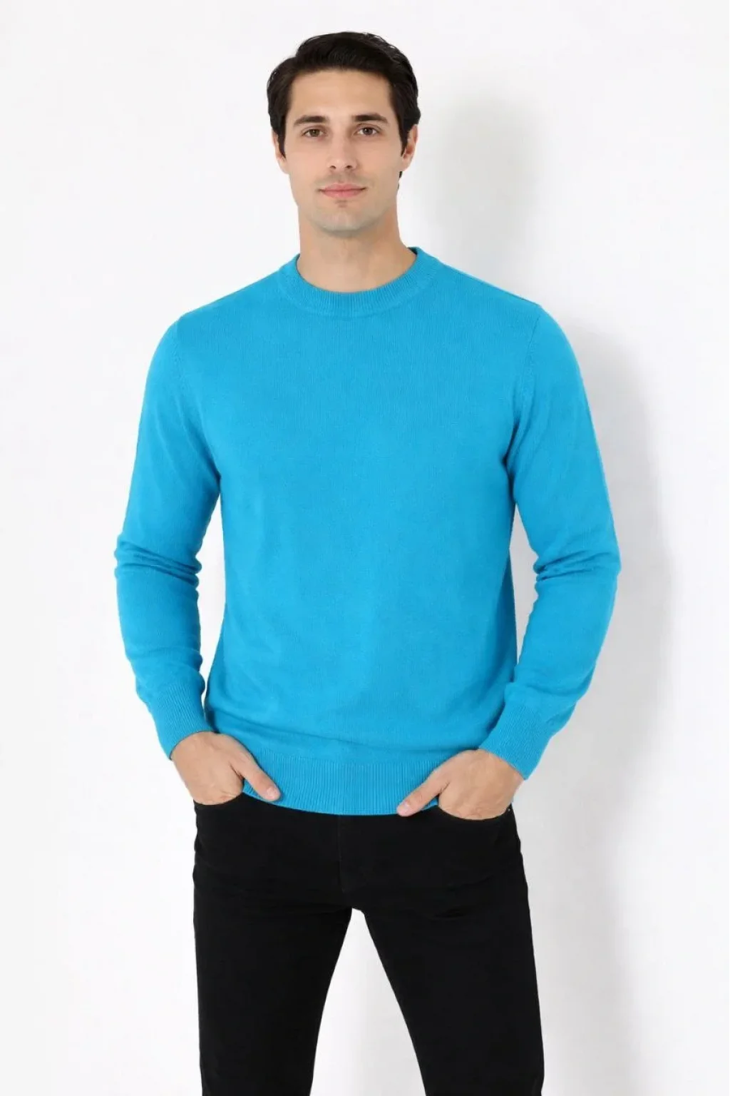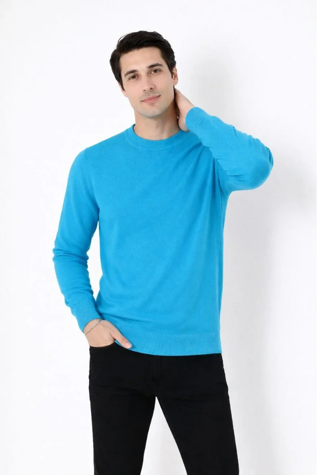 Erkek Bisiklet Yaka Triko Kazak yumuşak dokulu Pamuklu ince Dokuma, uzun kollu Rahat Regular kalıp - Mavi
