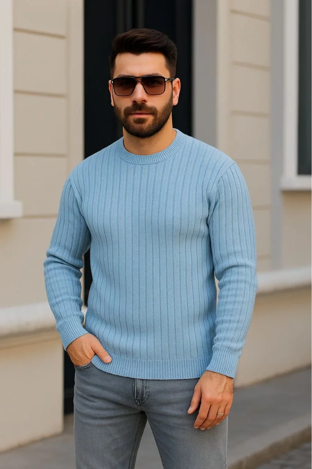 Erkek Bisiklet Yuvarlak Yaka Triko Kazak Pamuklu Kalın Fitilli Dokuma, Regular Fit Uzun Kollu Kışlık Model - Bebe Mavisi