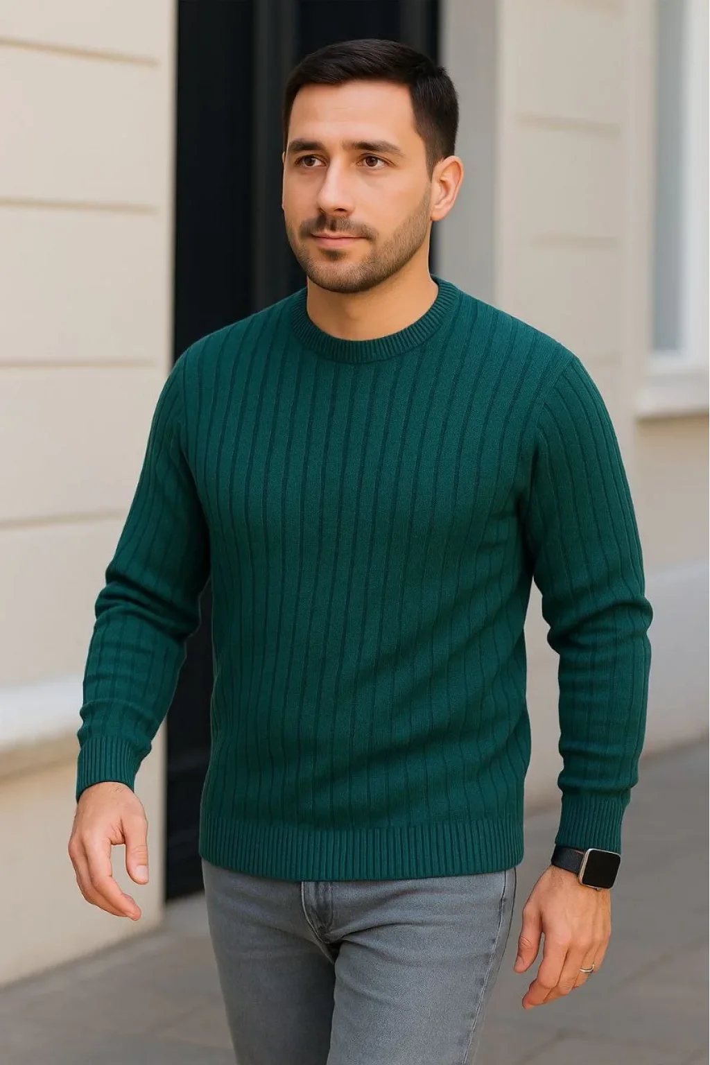 Erkek Bisiklet Yuvarlak Yaka Triko Kazak Pamuklu Kalın Fitilli Dokuma, Regular Fit Uzun Kollu Kışlık Model - Haki