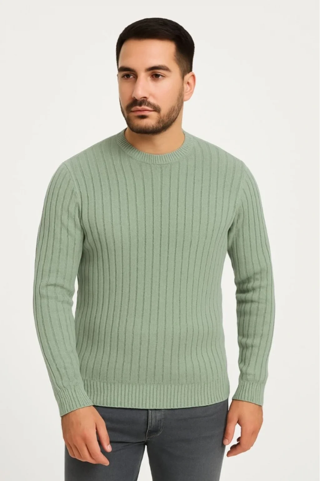 Erkek Bisiklet Yuvarlak Yaka Triko Kazak Pamuklu Kalın Fitilli Dokuma, Regular Fit Uzun Kollu Kışlık Model - Mint Yeşili