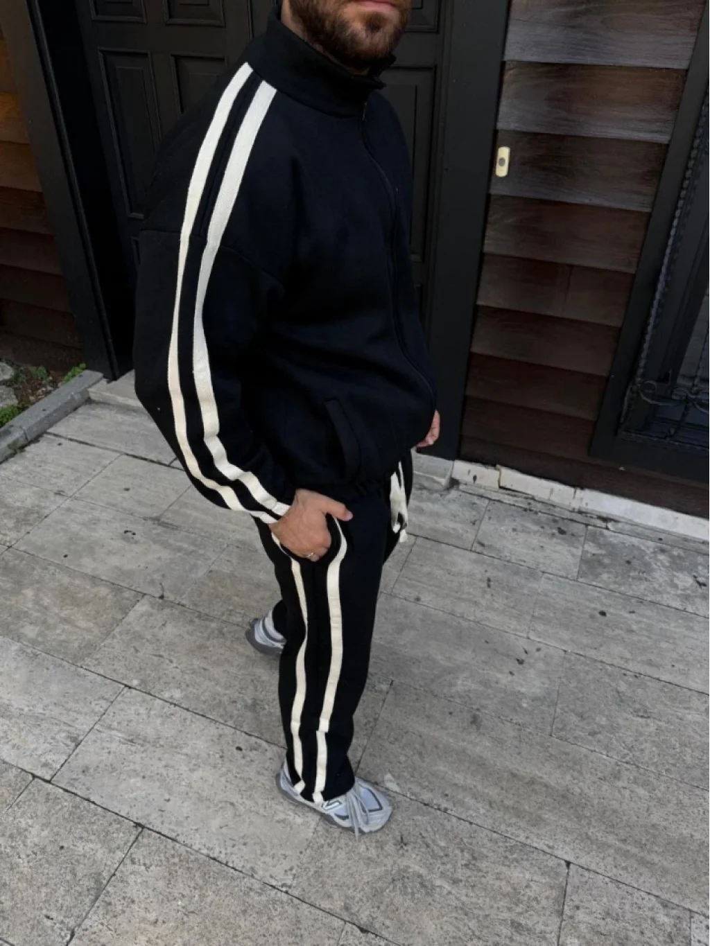 Erkek Çift Şeritli Eşofman Takım Dik Yaka Fermuarlı Sweatshirt Boru Paça Alt, Oversize 3 Iplik Pamuklu - Siyah