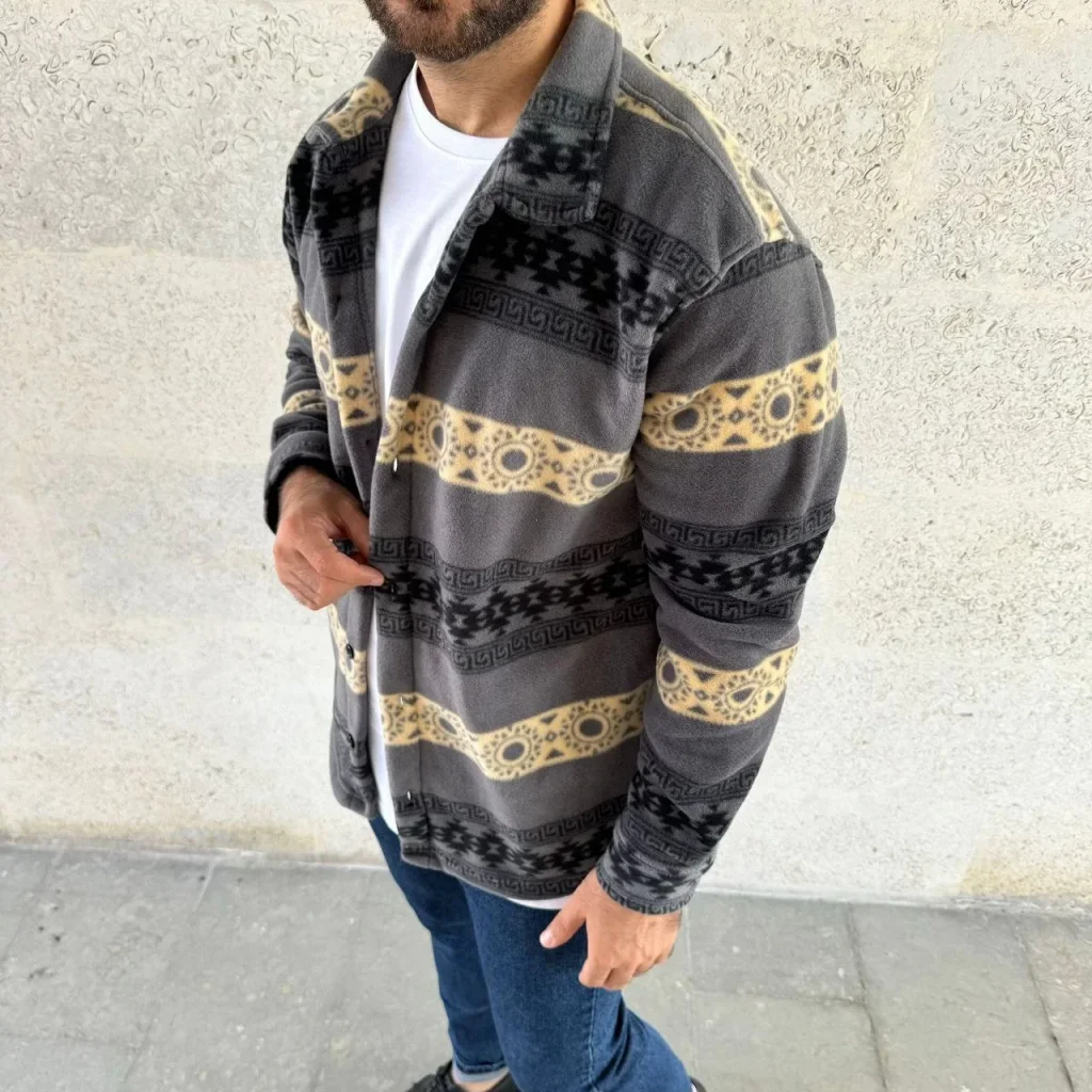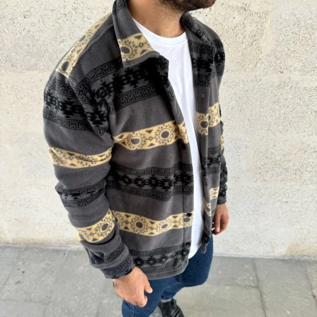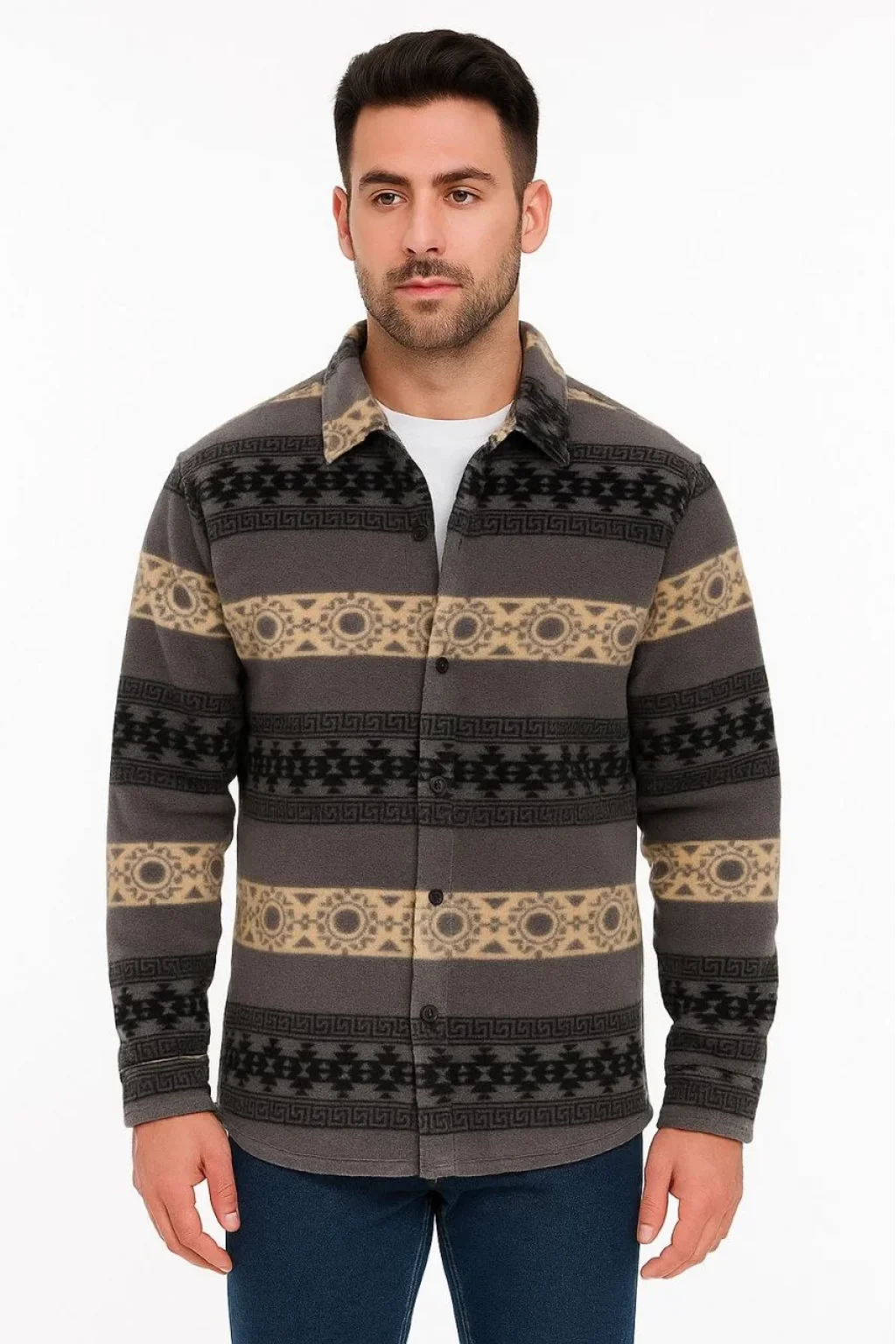 Erkek Desenli Polar Gömlek – Etnik Şerit Desen Yakalı, Uzun Kollu, Düğmeli, Oversize Rahat Kalıp - Füme
