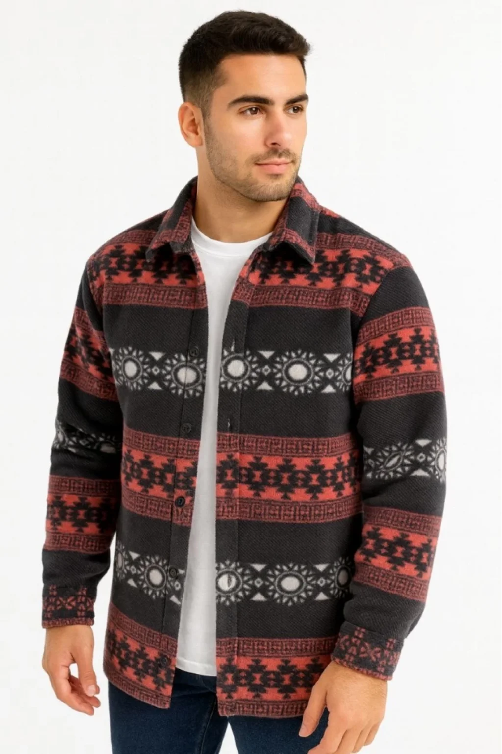 Erkek Desenli Polar Gömlek – Etnik Şerit Desen Yakalı, Uzun Kollu, Düğmeli, Oversize Rahat Kalıp - Füme