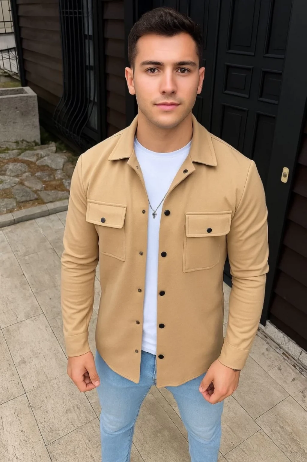 Erkek Diagonal Kumaş Cepli Çıtçıtlı Uzun Kollu, Gömlek Oversize Rahat Kalıp Günlük Şık Stil - Bej