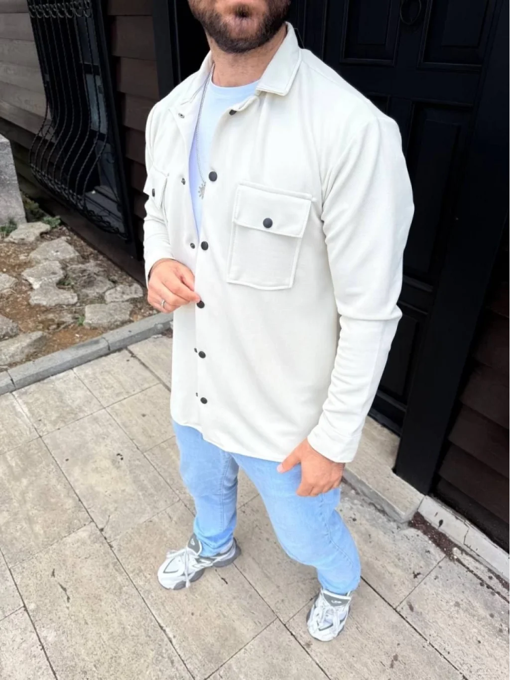Erkek Diagonal Kumaş Cepli Çıtçıtlı Uzun Kollu, Gömlek Oversize Rahat Kalıp Günlük Şık Stil - Beyaz