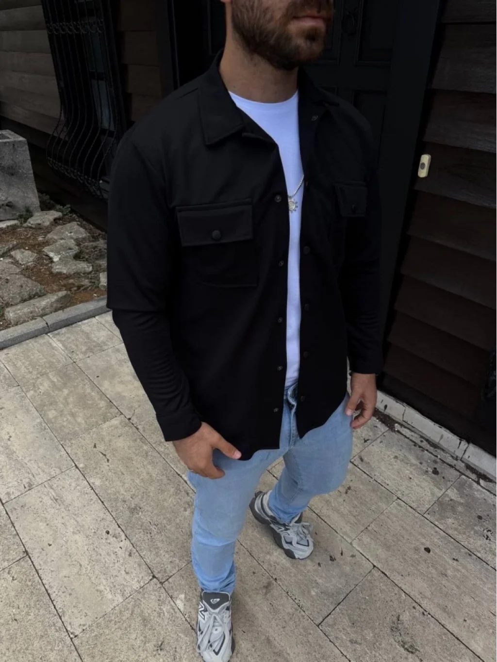 Erkek Diagonal Kumaş Cepli Çıtçıtlı Uzun Kollu, Gömlek Oversize Rahat Kalıp Günlük Şık Stil - Siyah